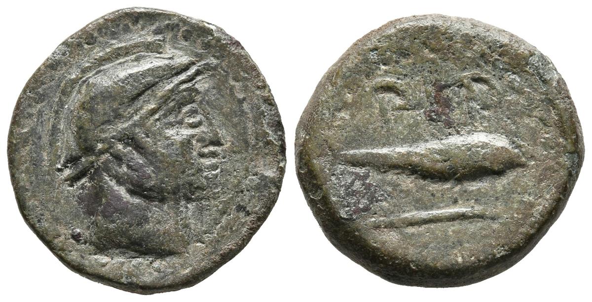 SEXI (Almuñécar, Granada). Semis. (Ae. 5,20g/20mm). 200-20 a.C. (FAB-2241). Anv: Cabeza con casco a derecha. Rev: Atún a derecha, encima leyenda púnica tipo AA, debajo letra Alef. MBC.