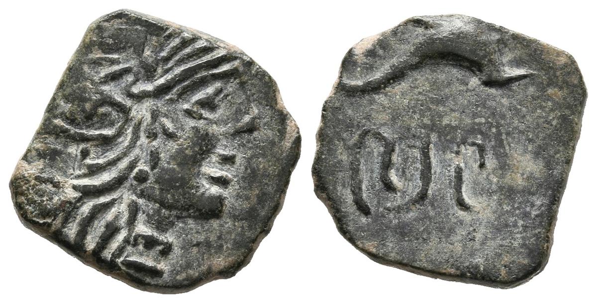 SEXI (Almuñécar, Granada). Cuadrante. (Ae. 2,02g/14mm). 200-20 a.C. (FAB-2244). Anv: Cabeza femenina galeada a derecha. Rev: Delfín a derecha, debajo leyenda púnica tipo B. MBC+.