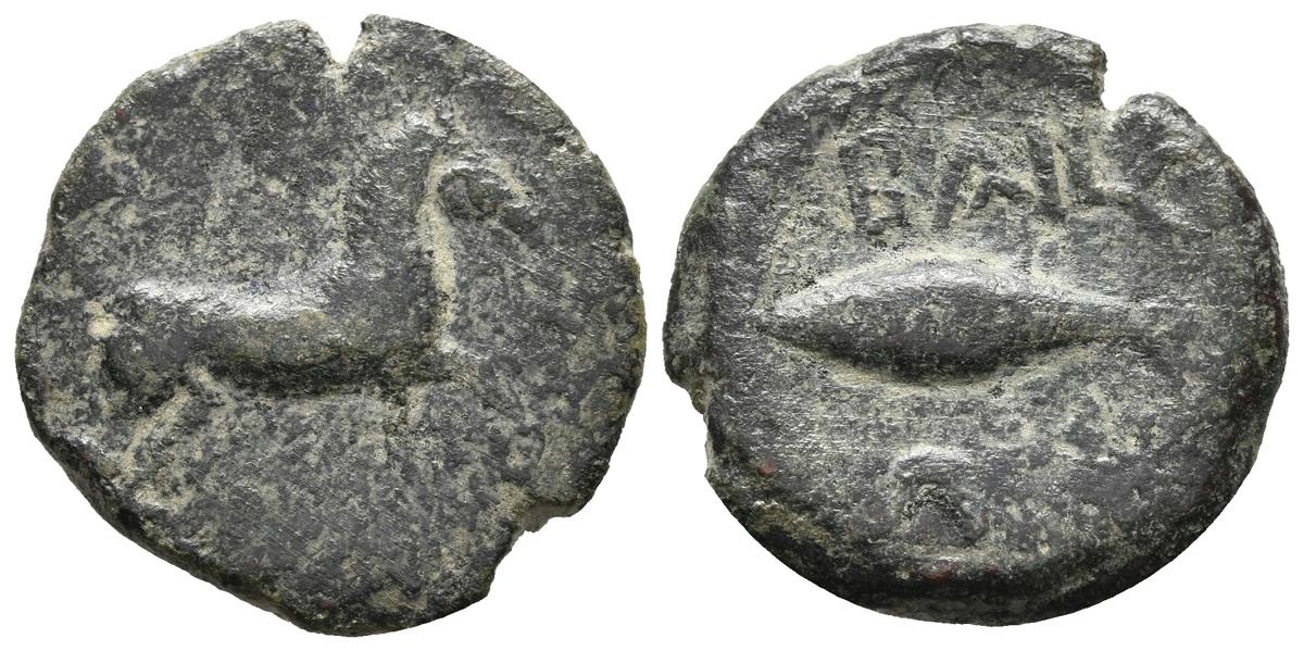 BAILO (Tarifa, Cádiz). Cuadrante. (Ae. 4,92g/21mm). 50 a.C. (FAB-189). Anv: Caballo a derecha. Rev: Atún a izquierda, encima: BAILO, debajo creciente. MBC.