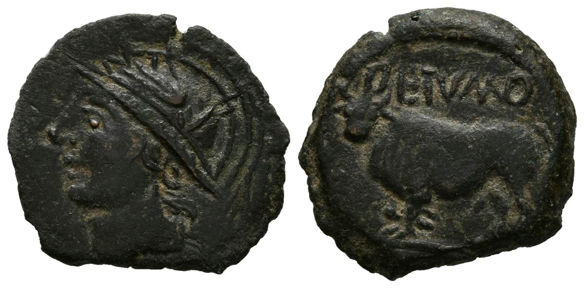 SISIPO (entre Jerez y Arcos de la Frontera, Cádiz). Semis. (Ae. 2,80g/19mm). 50-20 a.C. (FAB-2257). Anv: Cabeza con casco a izquierda. Rev: Toro a izquierda sobre línea, encima leyenda: DETVMO, debajo: SISIPO. MBC+.