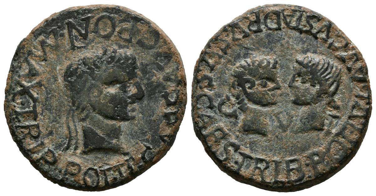 TARRACO (Tarragona). As. (Ae. 8,09g/24mm). 27 a.C.-14 d.C. (FAB-2356). Anv: Cabeza laureada de Augusto a derecha, alrededor leyenda: IMP CAES AVG TR PONT MAX P P. Rev: Cabezas de Cayo y Lucio enfrentadas, entre ellas: CVT, encima: CL CAES, debajo: AVG F. MBC-/MBC.