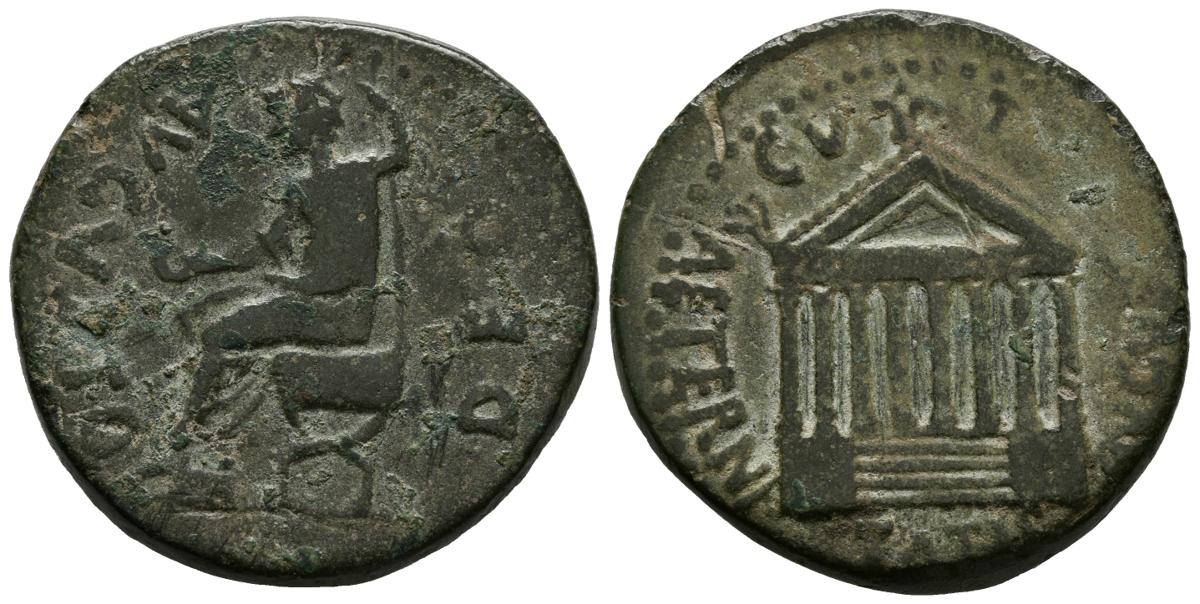 TARRACO (Tarragona). Dupondio. (Ae. 15,82g/31mm). 14-36 d.C. (FAB-2364). Anv: Augusto sentado con patera y cetro a izquierda, alrededor leyenda: AVGVSTO DEO. Rev: Templo octástilo con tres gradas, alrededor leyenda: AETERNATIS AVGVSTAE CVTT. MBC. Escaso.