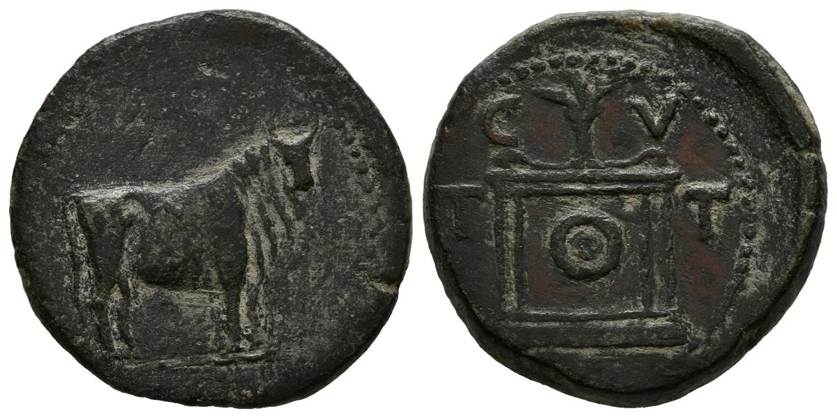TARRACO (Tarragona). Semis. (Ae. 4,93g/20mm). 14-36 d.C. (FAB-2377). Anv: Toro a derecha. Rev: Ara, alrededor leyenda: CVTT. MBC.