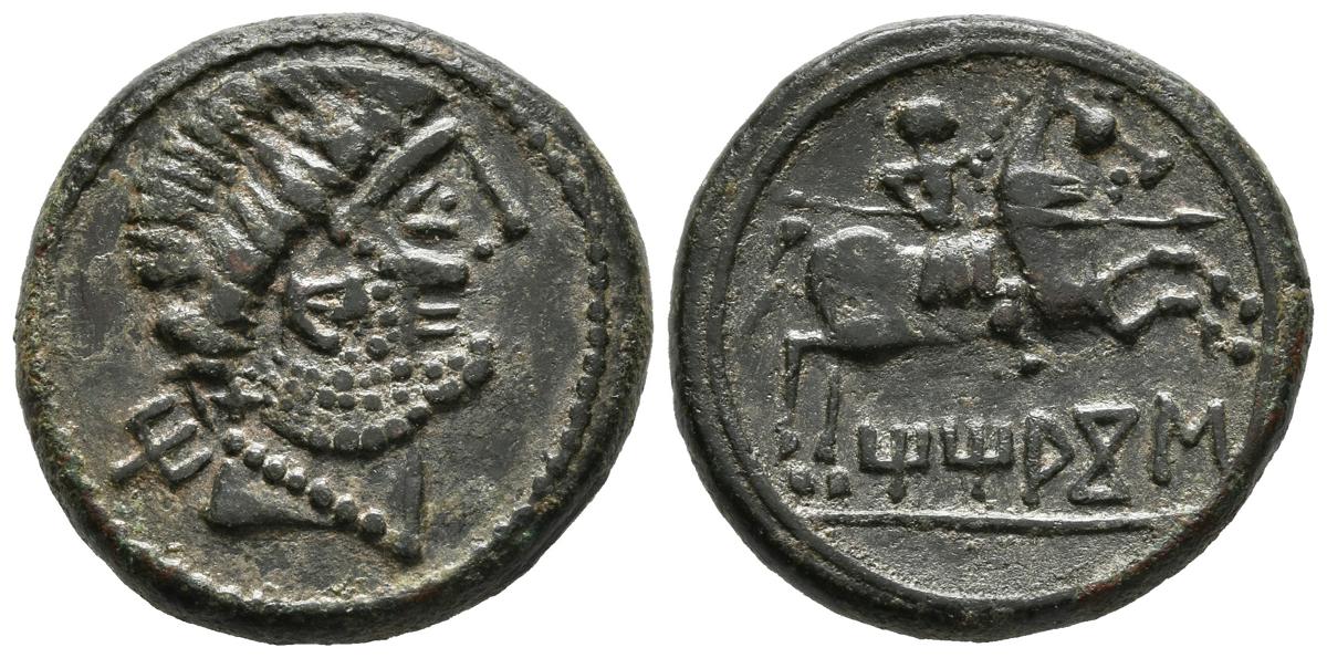 TITIACOS (Tricio, La Rioja). As. (Ae. 9,40g/23mm). 120-20 a.C. (FAB-2395). Anv: Cabeza barbada de arte bárbaro a derecha, detrás letra Ti. Rev: Jinete con lanza a derecha, debajo leyenda ibérica sobre línea: TiTiACoS. EBC-.