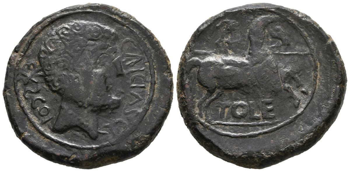 TOLE (Toledo). As. (Ae. 21,92g/31mm). 50-20 a.C. (FAB-2408). Anv: Cabeza masculina a derecha, alrededor leyenda: EX S COI CAICIAS. Rev: Jinete con lanza a derecha, debajo leyenda bajo línea: TOLE. MBC+.