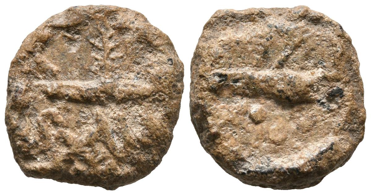 BALSA (Tavira, Portugal). Plomo monetiforme. (Pb. 8,32g/20mm). (CCP-2). Anv: Nave a derecha, debajo leyenda: BALSA. Rev: Atún a derecha, encima X y tres puntos. MBC.