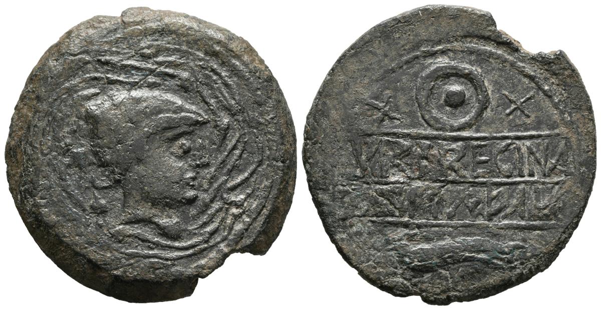 TURRIRREGINA (Casas de la Reina, Badajoz). As. (Ae. 17,06g/32mm). 50 a.C. (FAB-2646 var). Anv: Cabeza masculina con casco a derecha, alrededor tallos de vid. Rev: Falcata y rodela, entre rodela dos X, entre ambos leyenda: TVRRIRREGINA y leyenda libio-fenicia. MBC-. Escaso.