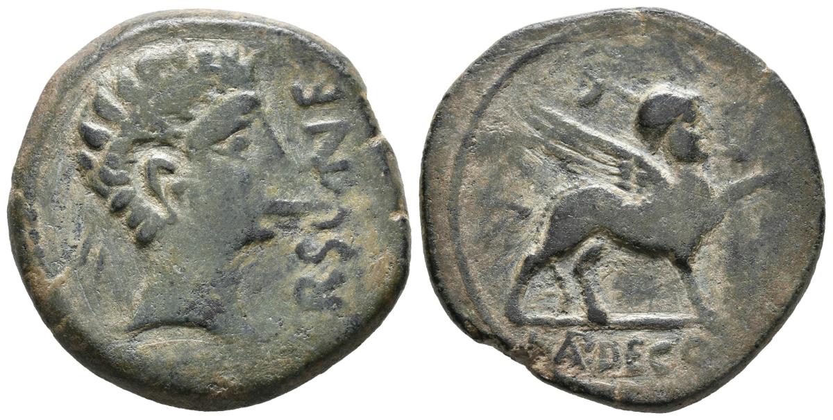 URSONE (Osuna, Sevilla). As. (Ae. 12,15g/28mm). 50 a.C. (FAB-2498). Anv: Cabeza masculina diademada a derecha, delante leyenda: VRSONE. Rev: Esfinge a derecha, encima S, debajo de línea leyenda: L AP DEC Q F. MBC.