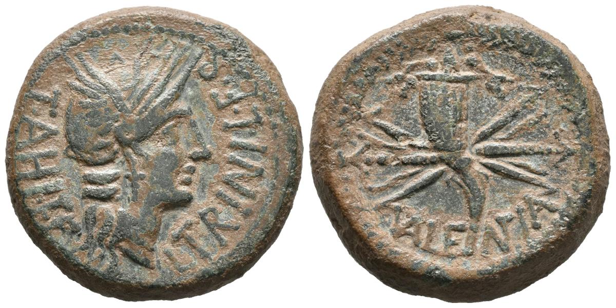 VALENTIA (Valencia). As. (Ae. 19,66g/28mm). 150-50 a.C. (FAB-2512). Anv: Cabeza galeada de Roma a derecha, alrededor leyenda: TAHI T F Y L TRINI L F Q. Rev: Cornucopia sobre haz de rayos, debajo leyenda: VALENTIA, todo dentro de láurea. MBC+.