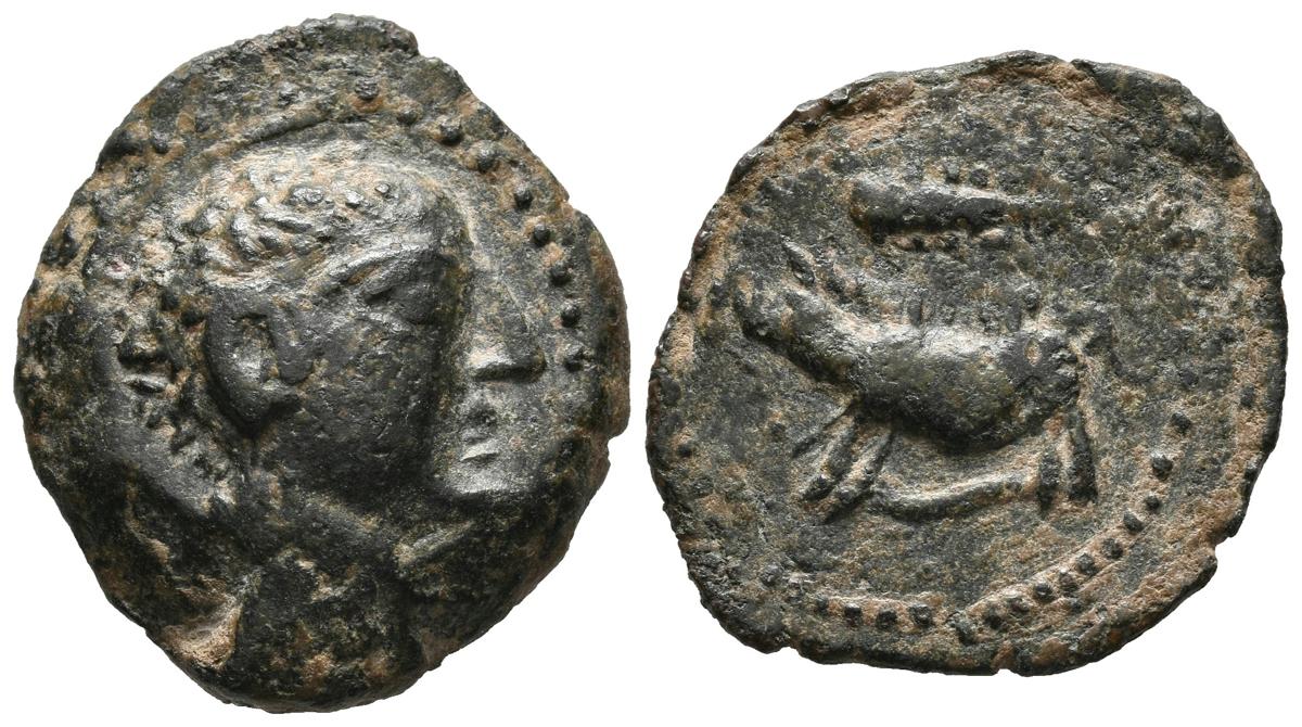 TIPO JABALI-CLAVA. Semis. (Ae. 7,90g/25mm). 180 a.C. (FAB-755). Anv: Cabeza masculina a derecha. Rev: Jabalí a izquierda, encima clava. MBC+.