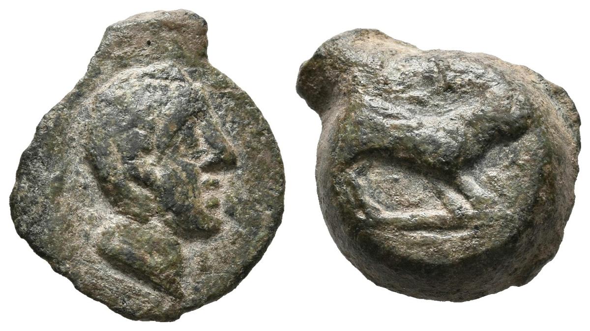 INCIERTO. Semis. (Ae. 3,85g/16mm). 150-100 a.C. (FAB-2250 var, como Sisapo). Anv: Cabeza masculina a derecha, detrás palma. MBC-.