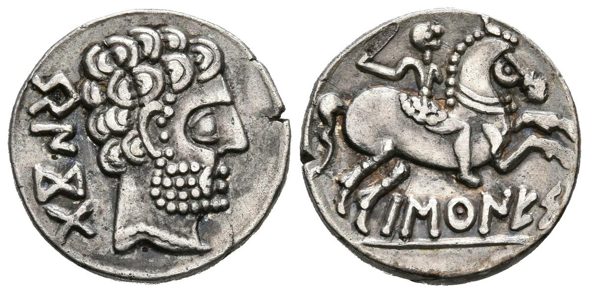 BASCUNES (Pamplona). Denario. (Ar. 3,43g/17mm). 120-20 a.C. (FAB-215). Anv: Cabeza masculina barbada a derecha, detrás leyenda ibérica: BeNCoDa. Rev: Jinete con espada a derecha, debajo leyenda ibérica: BaSCuNES. MBC+.