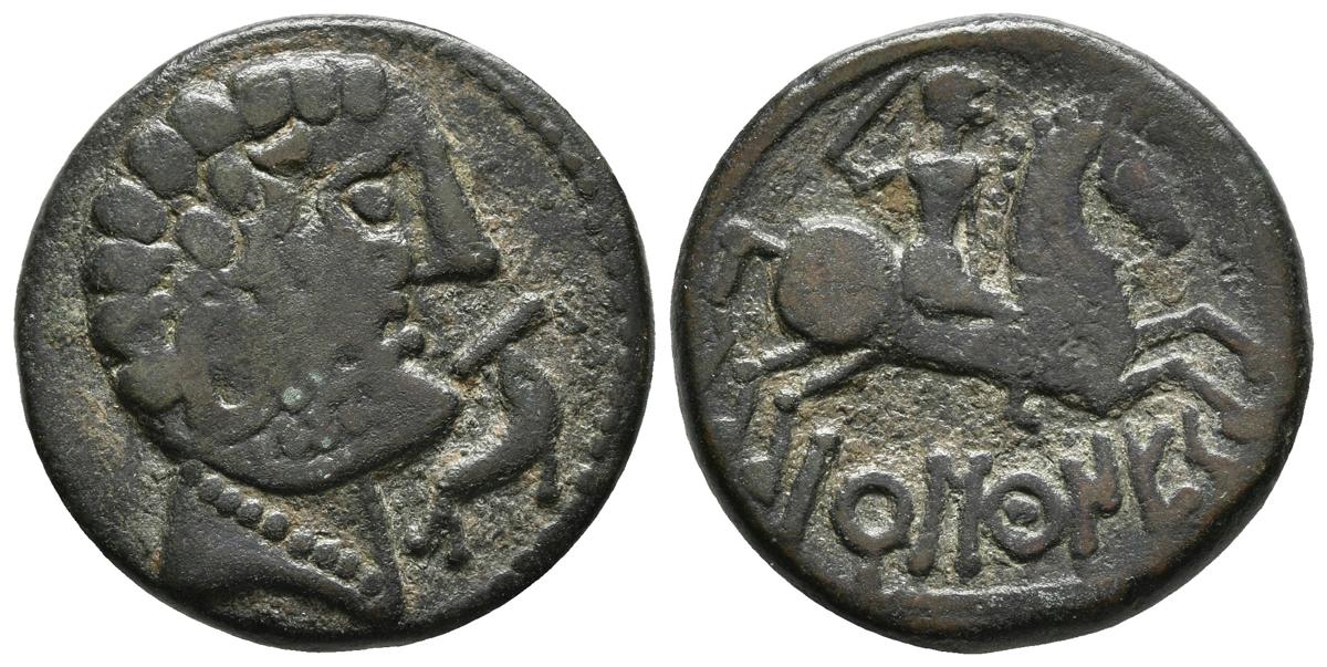 BARSCUNES (Pamplona, Navarra). As. (Ae. 8,81g/23mm). 120-20 a.C. (FAB-225). Anv: Cabeza barbada a derecha, delante delfín hacia arriba. Rev: Jinete con espada a derecha, debajo leyenda curva: BaRSCuNES. MBC-.