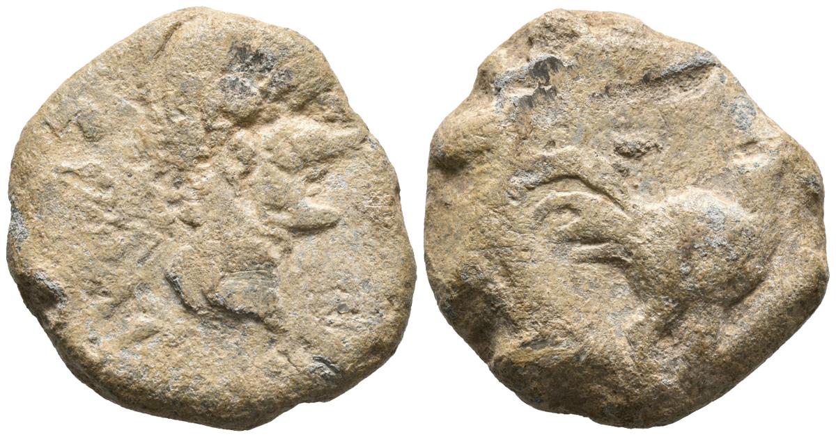 INCIERTO. Plomo monetiforme. (Pb. 40,56g/32mm). (CCP-1'). Anv: Cabeza con casco a derecha. Rev: Gallo a derecha. MBC-. Raro.