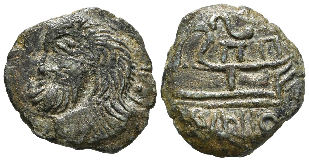 ACUÑACIONES ANONIMAS. Semis de imitación romana. (Ae. 5,50g/21mm). Siglo II a.C. (R&W 68a). Anv: Cabeza de Neptuno a izquierda, detrás S. Rev: Proa a izquierda, encima S tumbada, debajo leyenda ibérica. MBC+.
