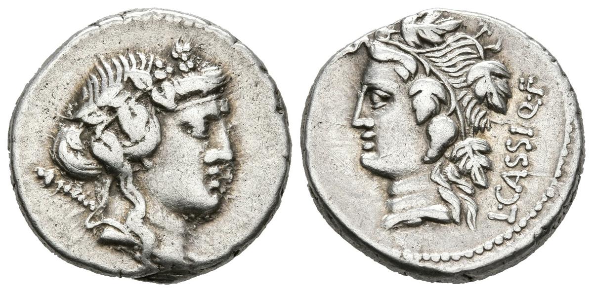 GENS CASSIA. Denario. (Ar. 3,87g/17mm). 78 a.C. Hispania. (FFC 556; Crawford 386/1). Cabeza de Libero Baco a derecha coronada de liras, detrás tirso. Rev: Cabeza diademada de Libera a izquierda, detrás leyenda: L CASSI Q F. MBC+.