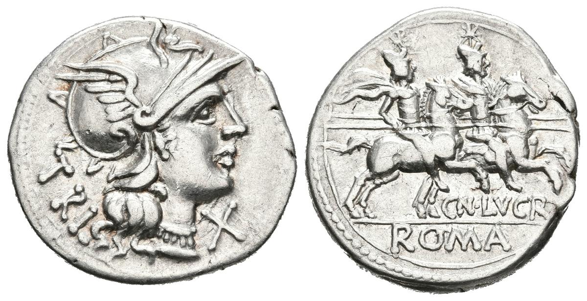 GENS LUCRETIA. Denario. (Ar. 3,91g/20mm). 136 a.C. Roma. (FFC 823; Crawford 237/1). Anv: Cabeza de Roma a derecha, detrás leyenda: TRI, delante X. Rev: Los Dioscuros a caballo a derecha, debajo leyenda: CN LVCR, en exergo: ROMA. MBC+. Variante de leyenda del anverso rara.