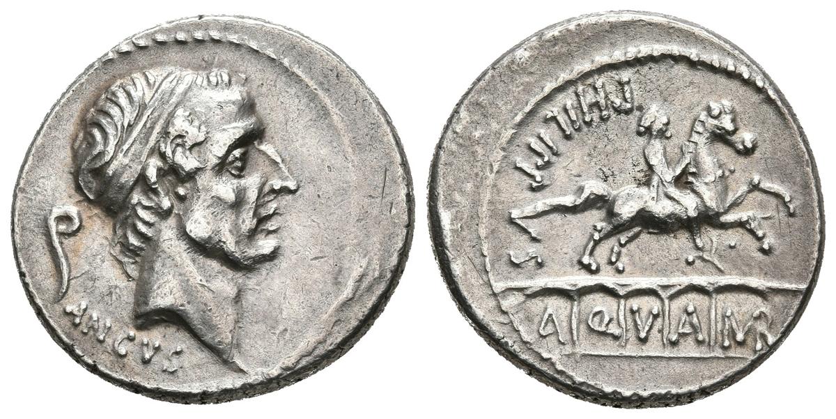 GENS MARCIA. Denario. (Ar. 4,02g/19mm). 56 a.C. Roma. (FFC 894; Crawford 425/1). Anv: Cabeza diademada de Ancus Marcius a derecha, detrás lítuo, debajo leyenda: ANCVS. Rev: Estatua ecuestre a derecha sobre un acueducto de cinco arcos, dentro de ellos: AQVA MAR, encima leyenda: PHILIPPVS. EBC-. Bonito ejemplar.