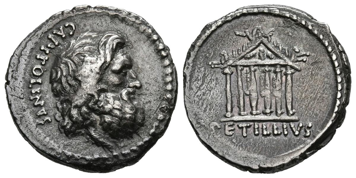 GENS PETILLIA. Denario. (Ar. 3,11g/19mm). 43 a.C. Roma. (FFC 960; Crawford 487/1). Anv: Cabeza de Júpiter a derecha, delante leyenda: CAPITOLINVS. Rev: Tempo hexástilo, debajo leyenda: PETILLIVS. MBC+. Bonita pátina.