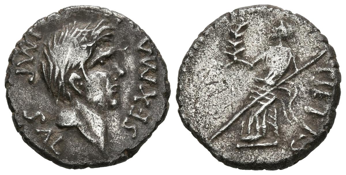 POMPEYO, el Grande. Denario. (Ar. 3,72g/17mm). 45-44 a.C. Hispania. (FFC 24; Crawford 477/1b). Anv: Cabeza descubierta de Pompeyo el Grande a derecha, alrededor leyenda: SEX MAGN IMP SAL. Rev: La Piedad de pie a izquierda con cetro y rama de laurel, detrás leyenda: PIETAS. MBC+. Muy raro.