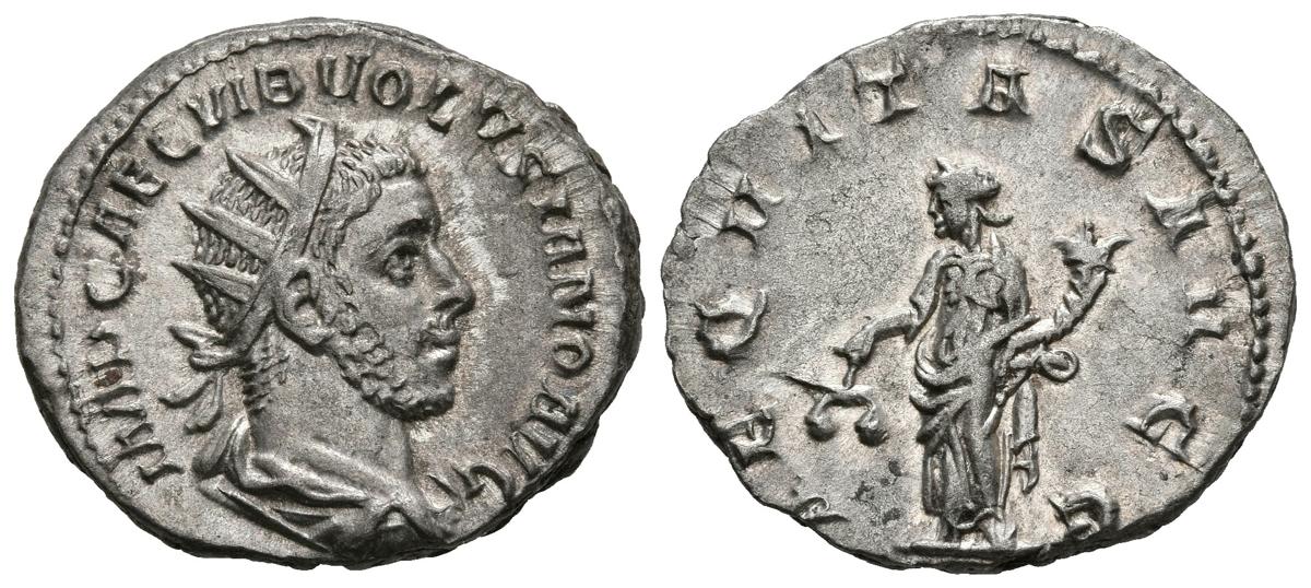 VOLUSIANO. Antoniniano. (Ar. 4,27g/21mm). 251-253 d.C. Roma. (RIC 166). Anv: Busto radiado y drapeado de Volusiano a derecha, alrededor leyenda: IMP CAE C VIB VOLVSIANO AVG. Rev: Aequitas estante a izquierda portando escalas y cornucopia, alrededor leyenda: AEQVITAS AVGG. EBC. Restos de brillo original. Precioso ejemplar, escaso así.