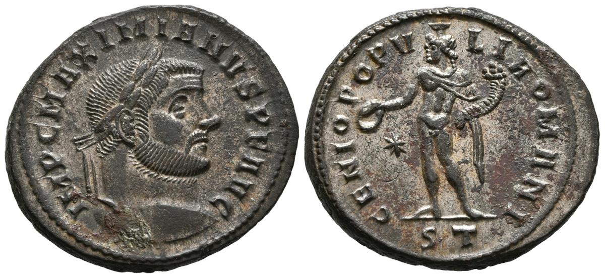MAXIMIANO. Follis. (Ae. 10,00g/29mm). 296-297 d.C. Ticino. (RIC 32a). Anv: Busto laureado de Maximiano a derecha, alrededor leyenda: IMP C MAXIMIANVS P F AVG. Rev: Genio estante a izquierda portando patera y cornucopia, en campo estrella, en exergo: ST, alrededor leyenda: GENIO POPVLI ROMANI. EBC+. Bonito ejemplar.
