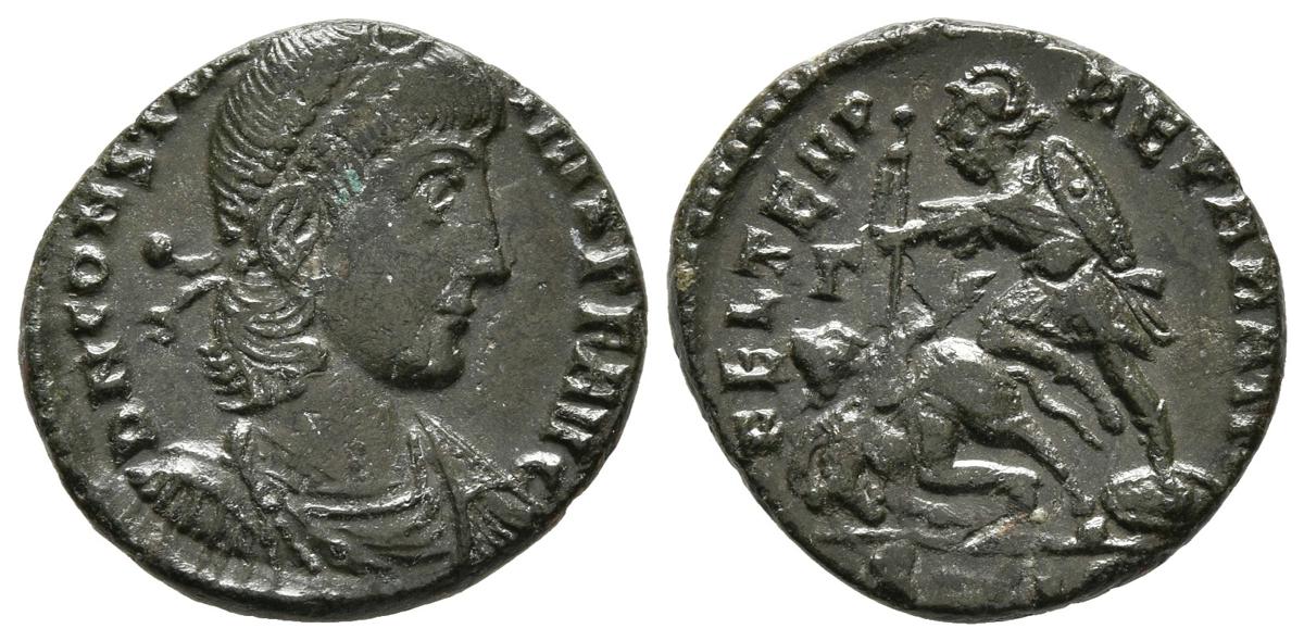 CONSTANCIO II. Centenional. (Ae. 2,47g/17mm). 350-355 d.C. Antioquía. (RIC 132). Anv: Busto laureado y drapeado de Constancio II a derecha, alrededor leyenda: D N CONSTANTIVS P F AVG. Rev: Soldado atacando con una lanza a un jinete caído del caballo, en exergo: AN¿Z?, alrededor leyenda: FEL TEMP REPARATIO. EBC.