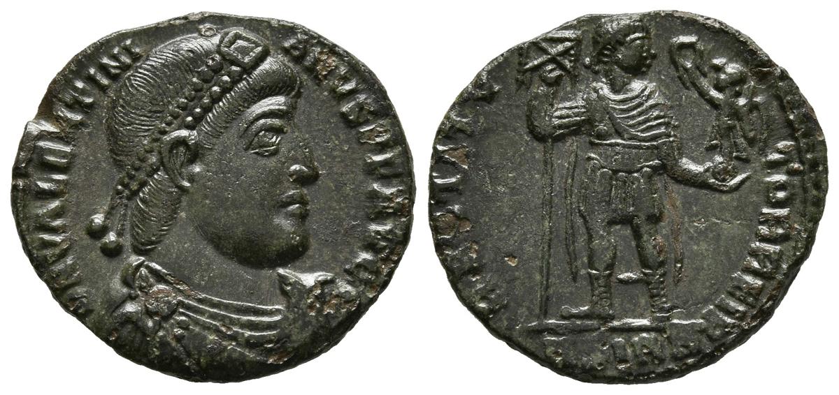 VALENTINIANO I. Follis. (Ae. 2,20g/18mm). 364-367 d.C. Sirmiun. (RIC 6a). Anv: Busto diademado, drapeado y con coraza de Valentiniano I, alrededor leyenda: D N VALENTINIANVS AVG. Rev: Valentiniano I estante a derecha portando estandarte y Victoria con corona de laurel, en exergo: ASIRM, alrededor leyenda: RESTITVTOR REIP. EBC+. Bonito ejemplar.