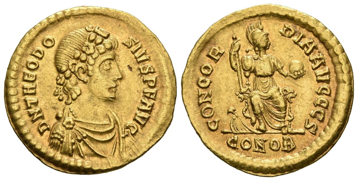 TEODOSIO I. Sólido. (Au. 4,48g/21mm). 379-383 d.C. Constantinopla. (RIC 45d). Anv: Busto diademado, drapeado y con coraza de Teododio I a derecha, alrededor leyenda: DN THEODOSIVS P F AVG. Rev: Constantinopla sentada a derecha portando globo y cetro, en exergo: CONOB, alrededor leyenda: CONCORDIA AVGGGÇ. EBC.