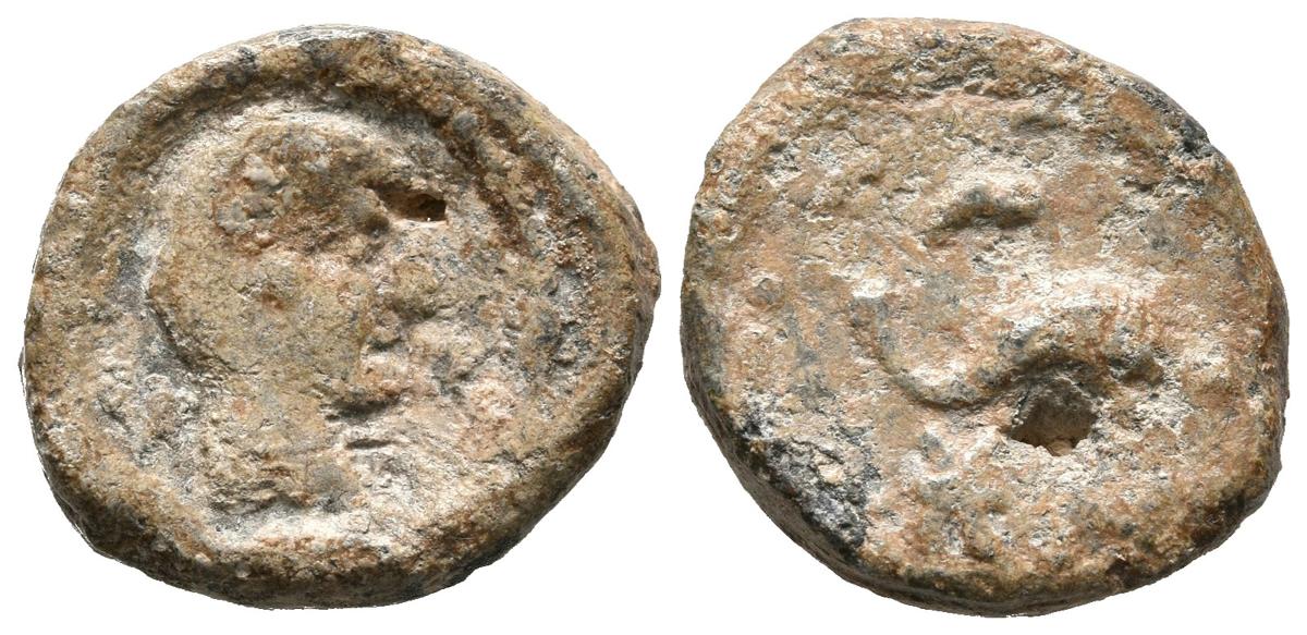 ¿BOLSCAN (Huesca)?. Plomo monetiforme. (Pb. 5,57g/17mm). (CCP no cita). Anv: Cabeza masculina a derecha. Rev: Delfín a derecha, encima creciente, debajo letras ibéricas: BoN. MBC. Perforación. Muy raro.