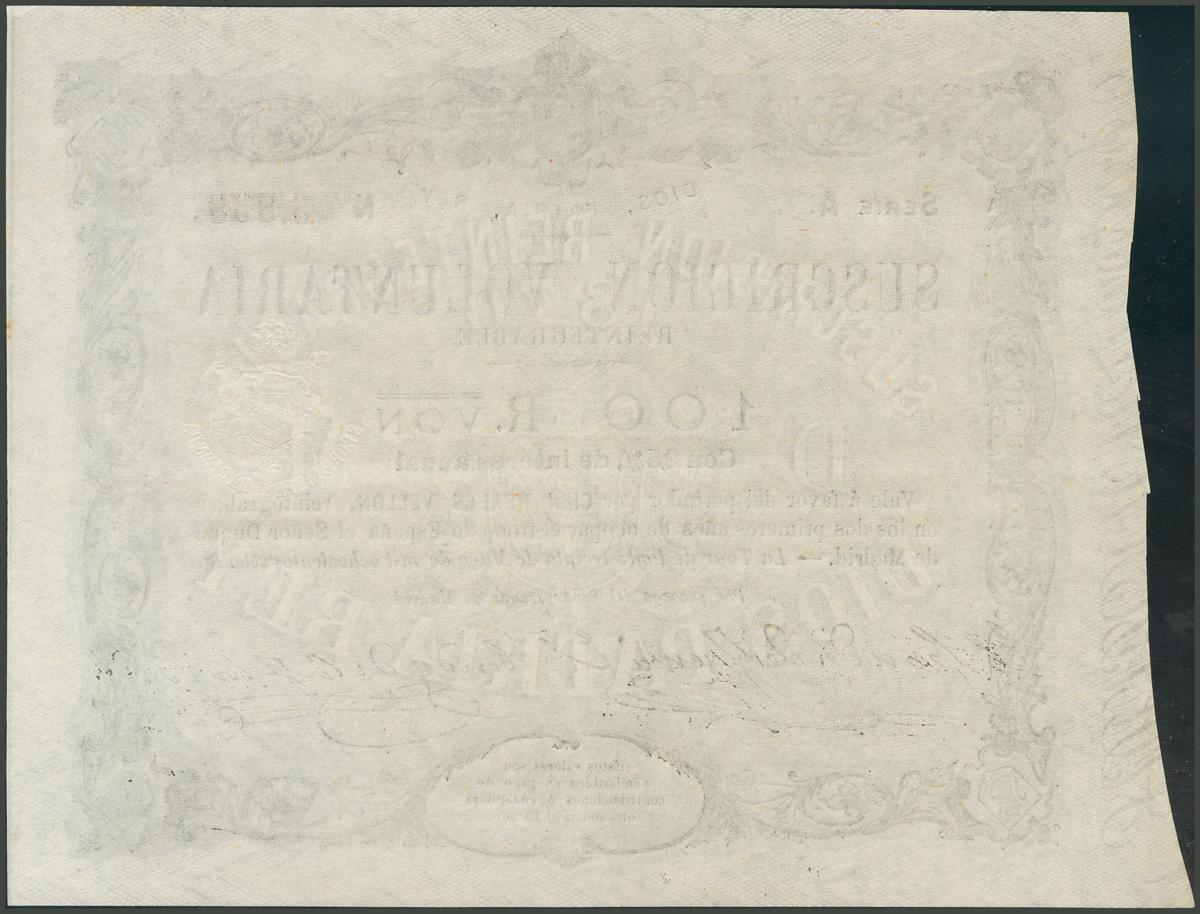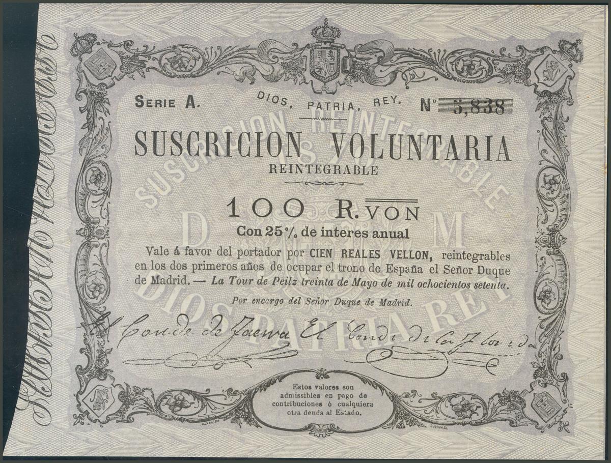 100 Reales de Vellón. 30 de Mayo de 1870. Emisión de Tour de Peilz. Serie A. (Edifil 2017: 196). EBC+.