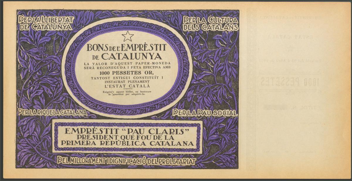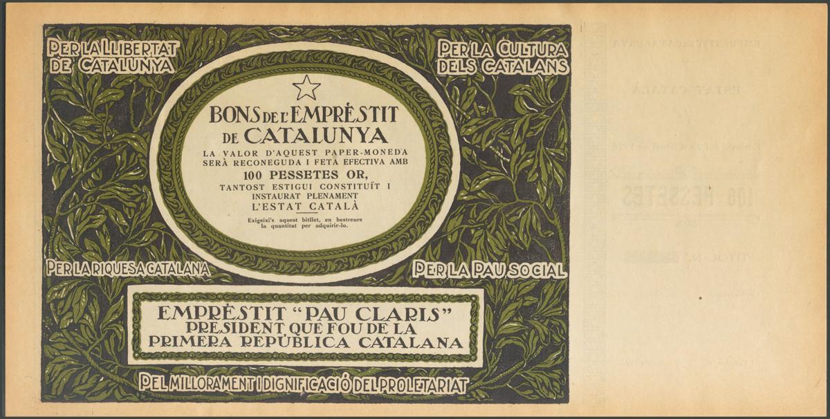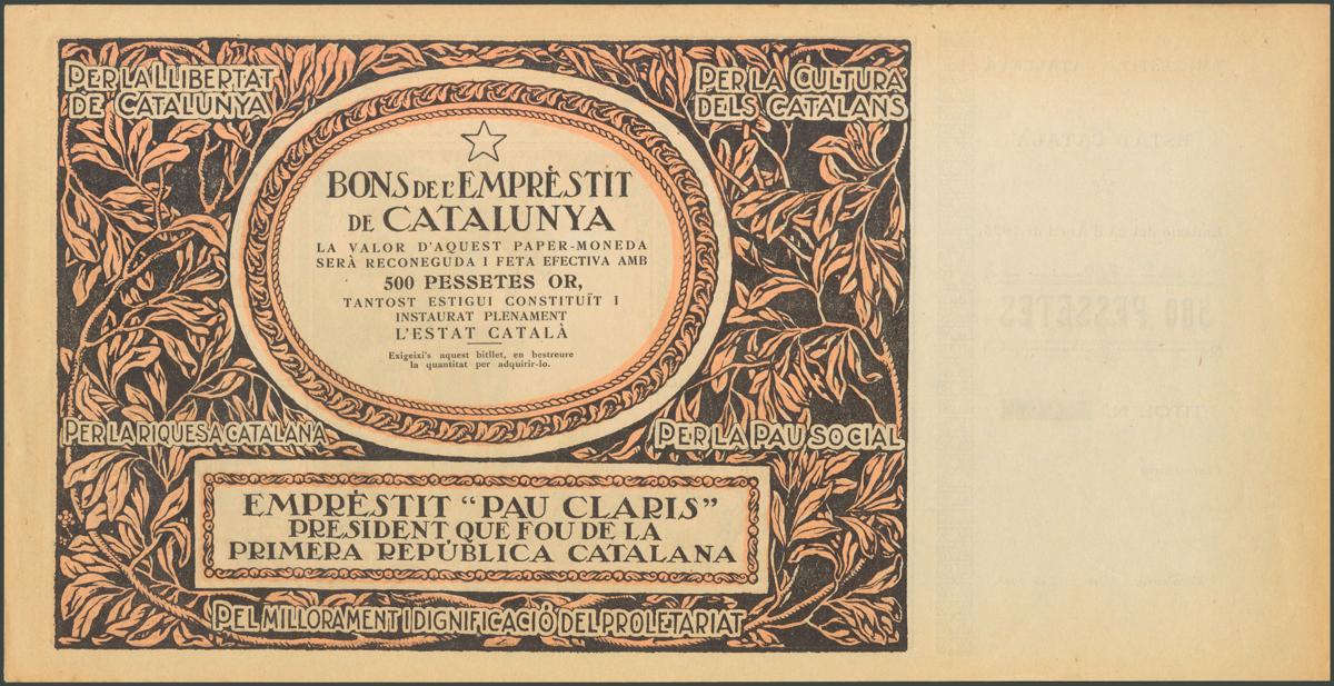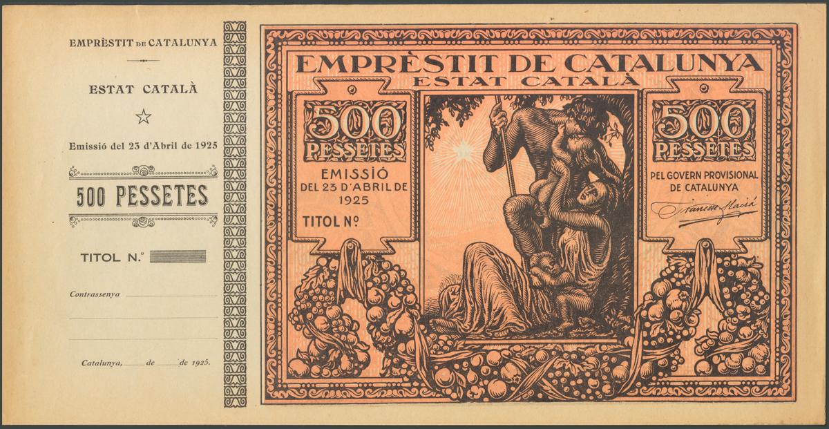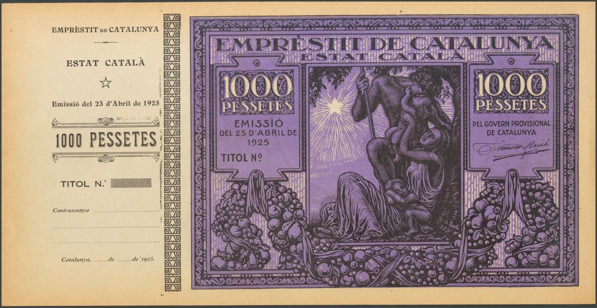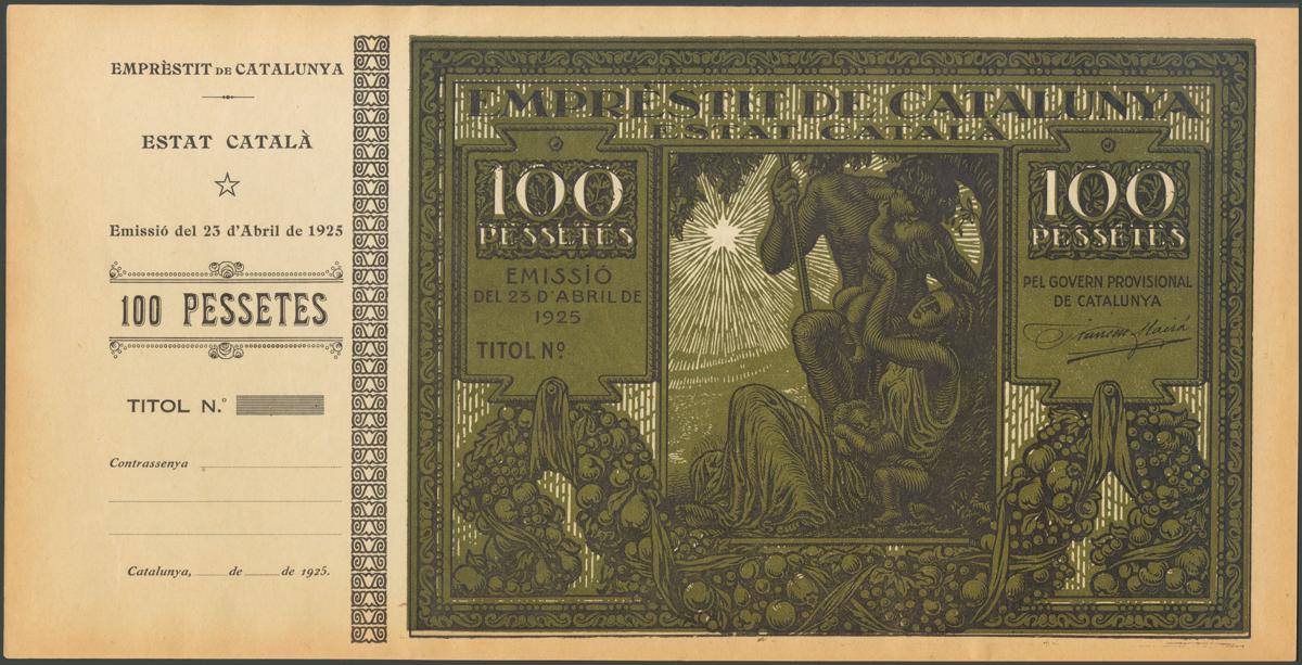 EMPRESTIT DE CATALUNYA. ESTAT CATALA. 100 Pessetes, 500 Pessetes y 1000 Pessetes. 23 de Abril de 1925. Emprestits Pau Clarís, diseñados por Miguel Soldevilla y firmados por Francesc Maciá en representación del Gobierno Provisional de Cataluña (esta emisión se destinó a sufragar los gastos de la acción armada y distribuída entre grupos de catalanes emigrados y simpatizantes de la causa independentista de la época). Precioso conjunto. SC-.