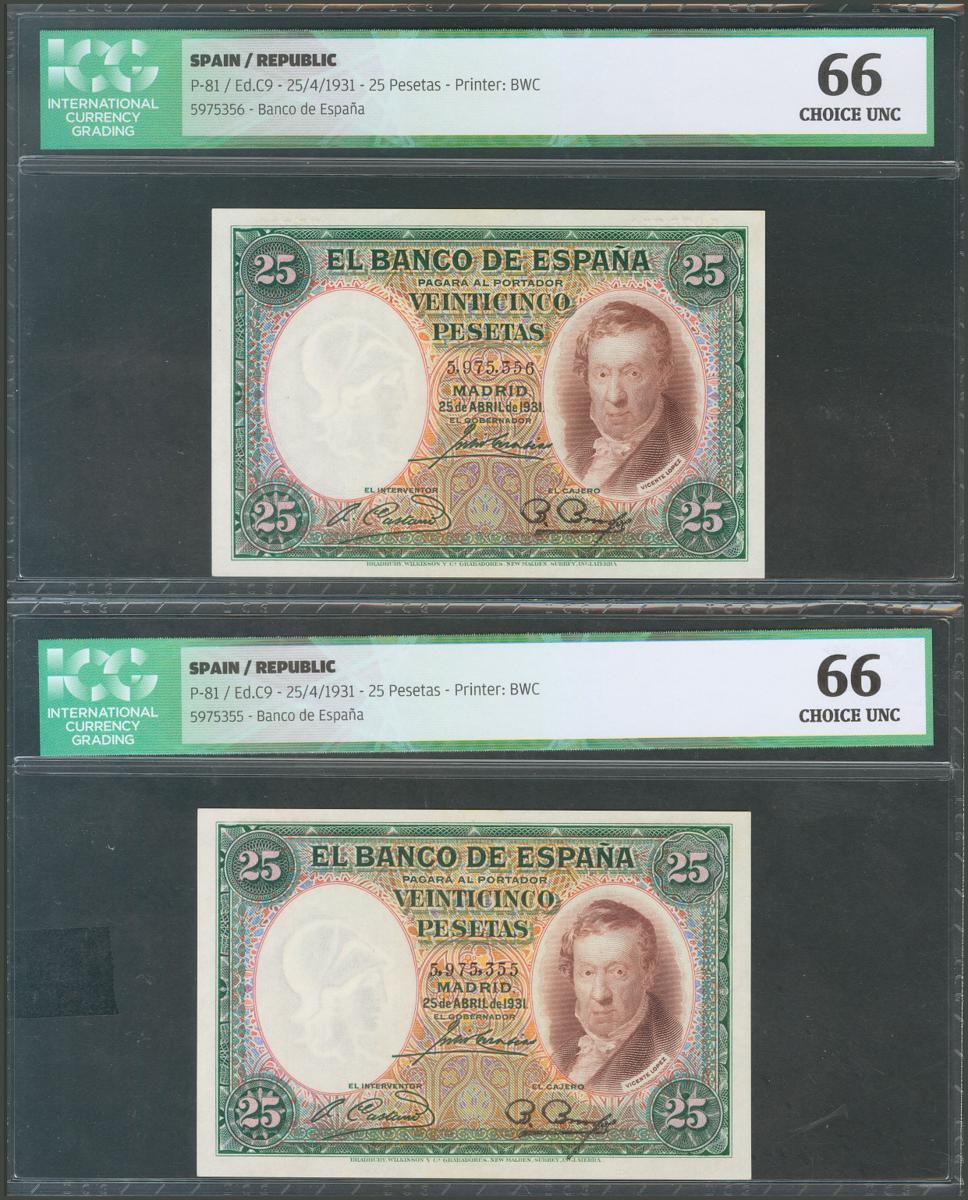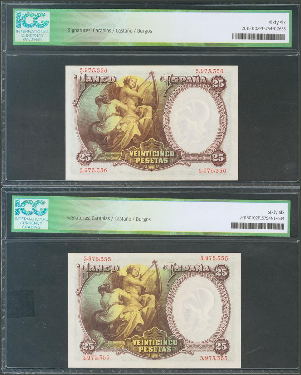 25 Pesetas. 25 de Abril de 1931. Pareja correlativa. Sin serie. (Edifil 2017: 358). SC. Encapsulado ICG66, ambos.