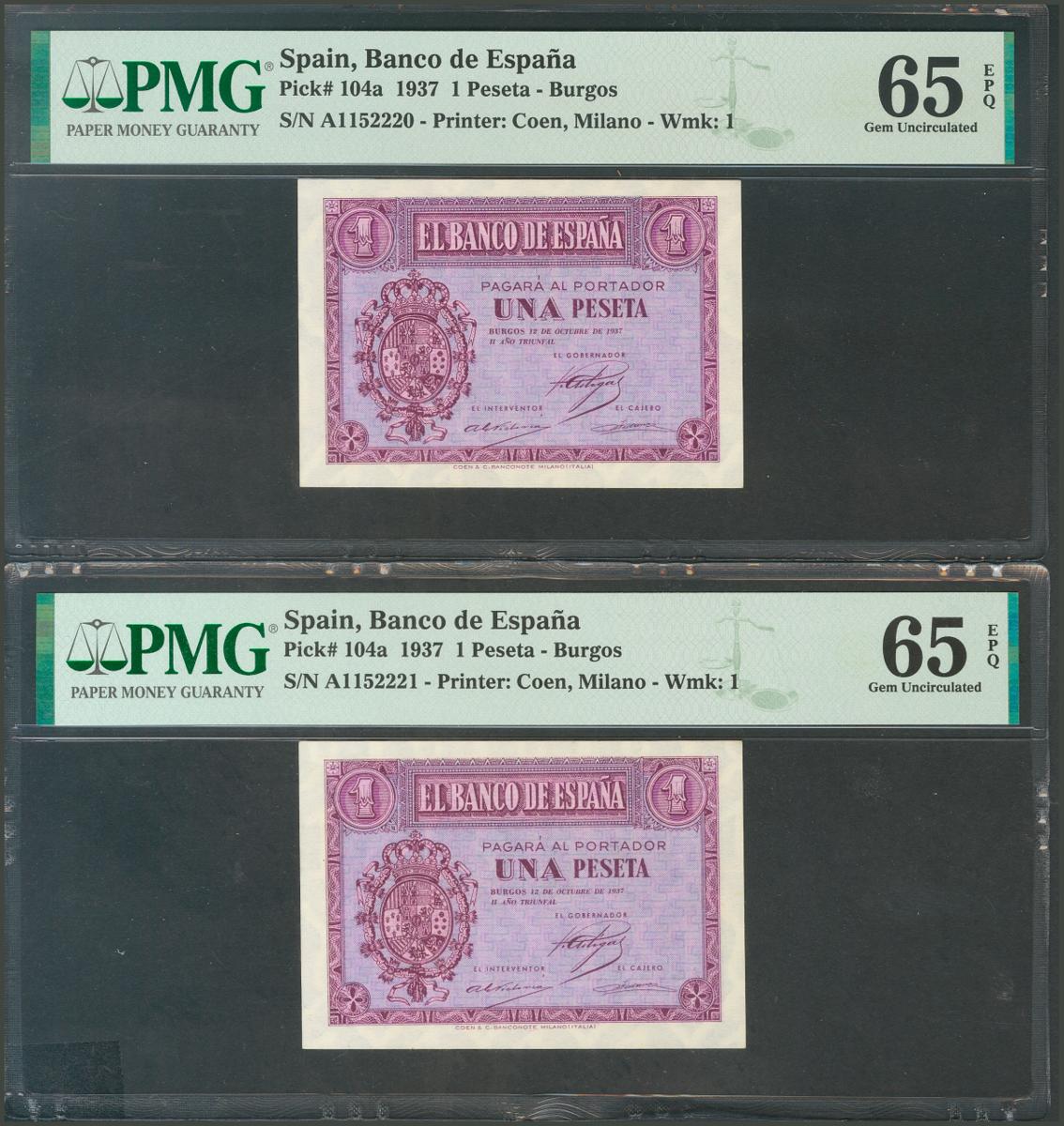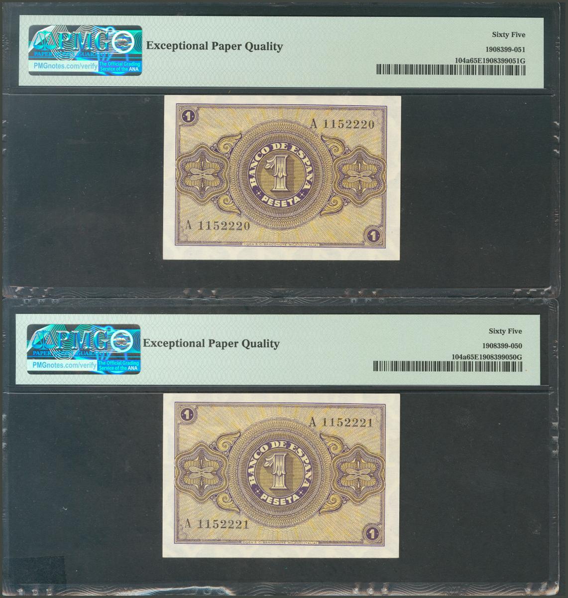 1 Peseta. 12 de Octubre de 1937. Pareja correlativa. Serie A. (Edifil 2017: 425). Inusual así, apresto original. SC. Encapsulados PMG65EPQ, ambos.