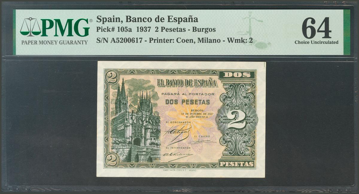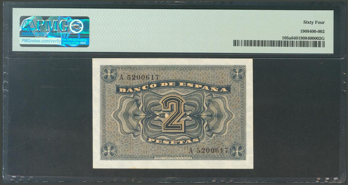 2 Pesetas. 12 de Octubre de 1937. Serie A. (Edifil 2017: 426). SC. Encapsulado PMG64.