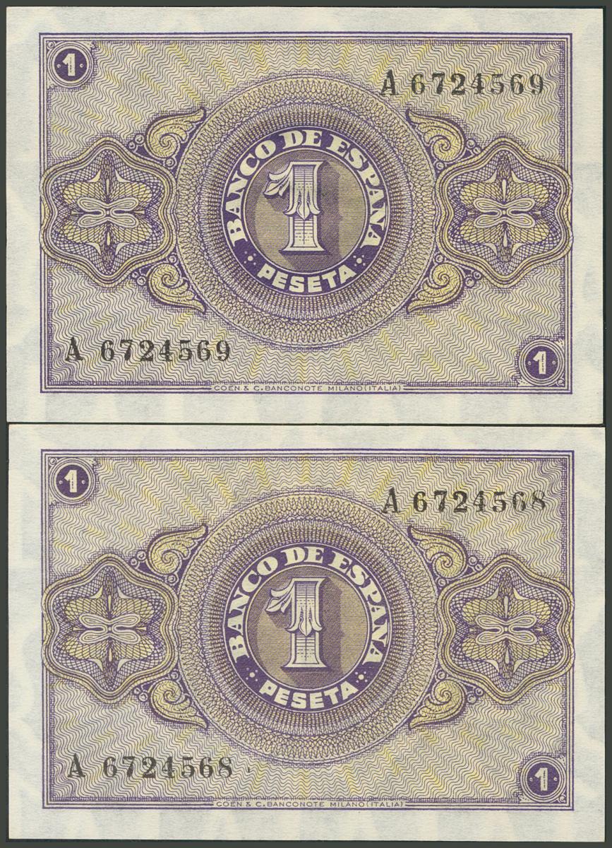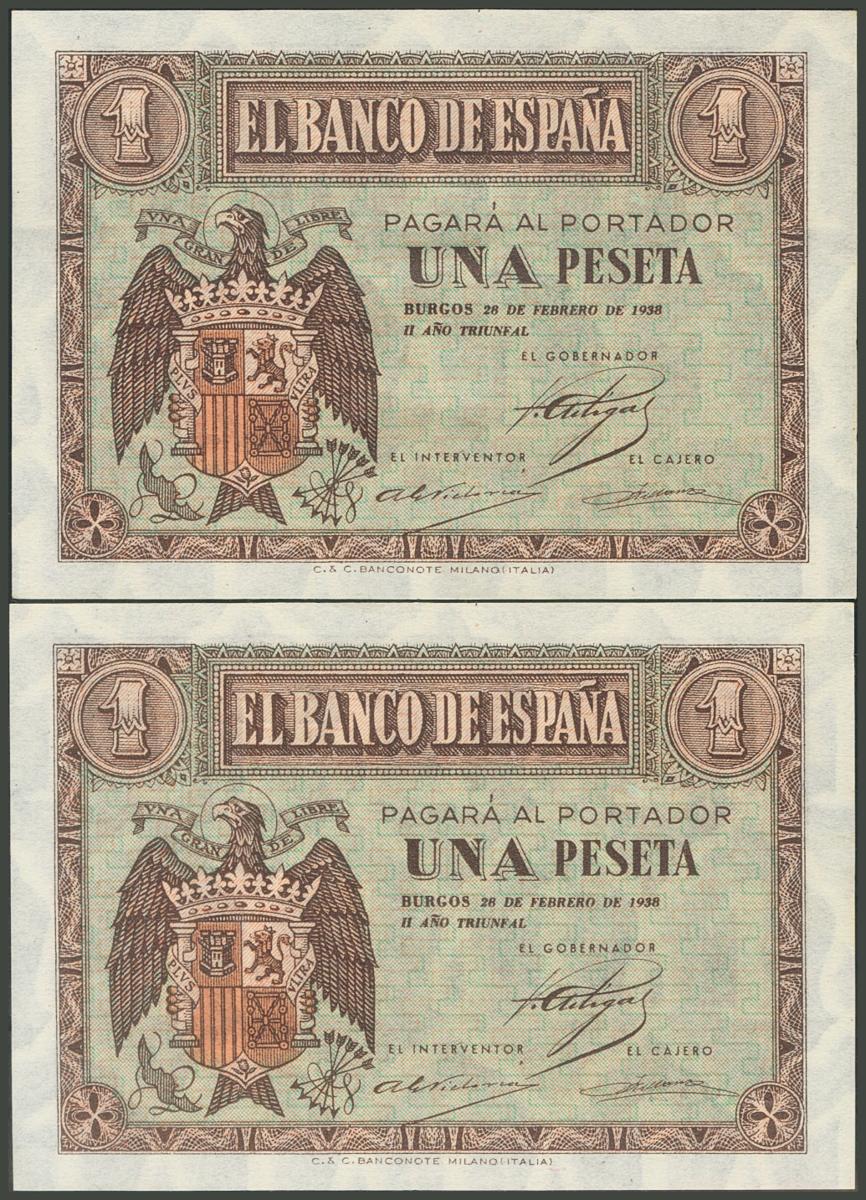 1 Peseta. 28 de Febrero de 1938. Pareja correlativa. Serie A. (Edifil 2017: 427). Apresto original. SC/EBC+.