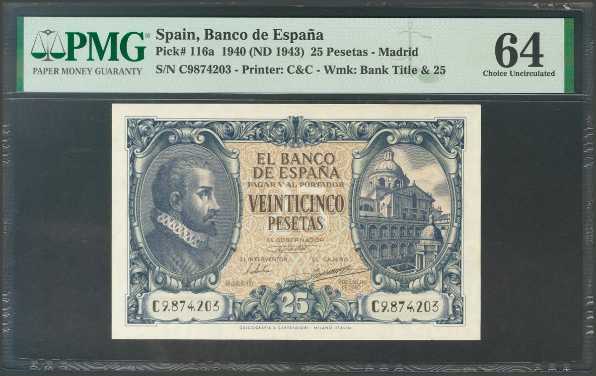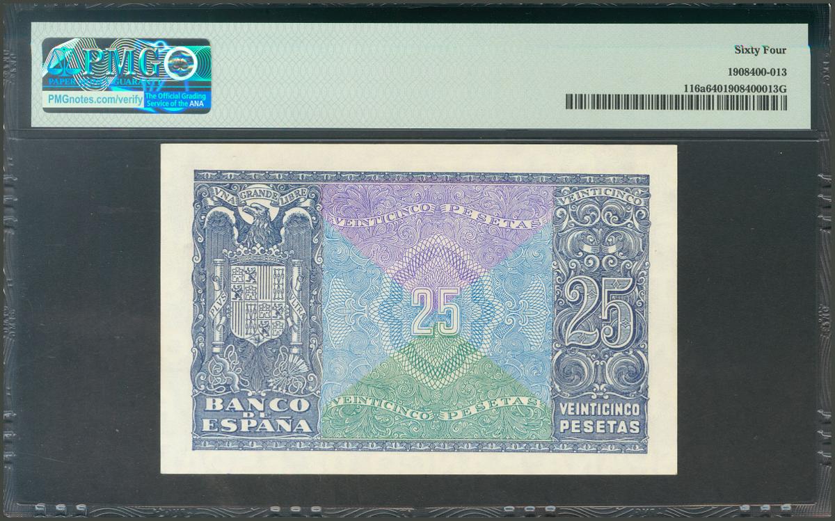 25 Pesetas. 9 de Enero de 1940. Serie C. (Edifil 2017: 436a). SC. Encapsulado PMG64.
