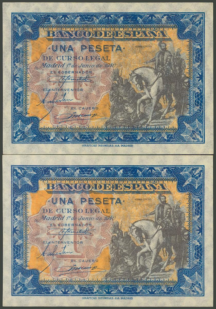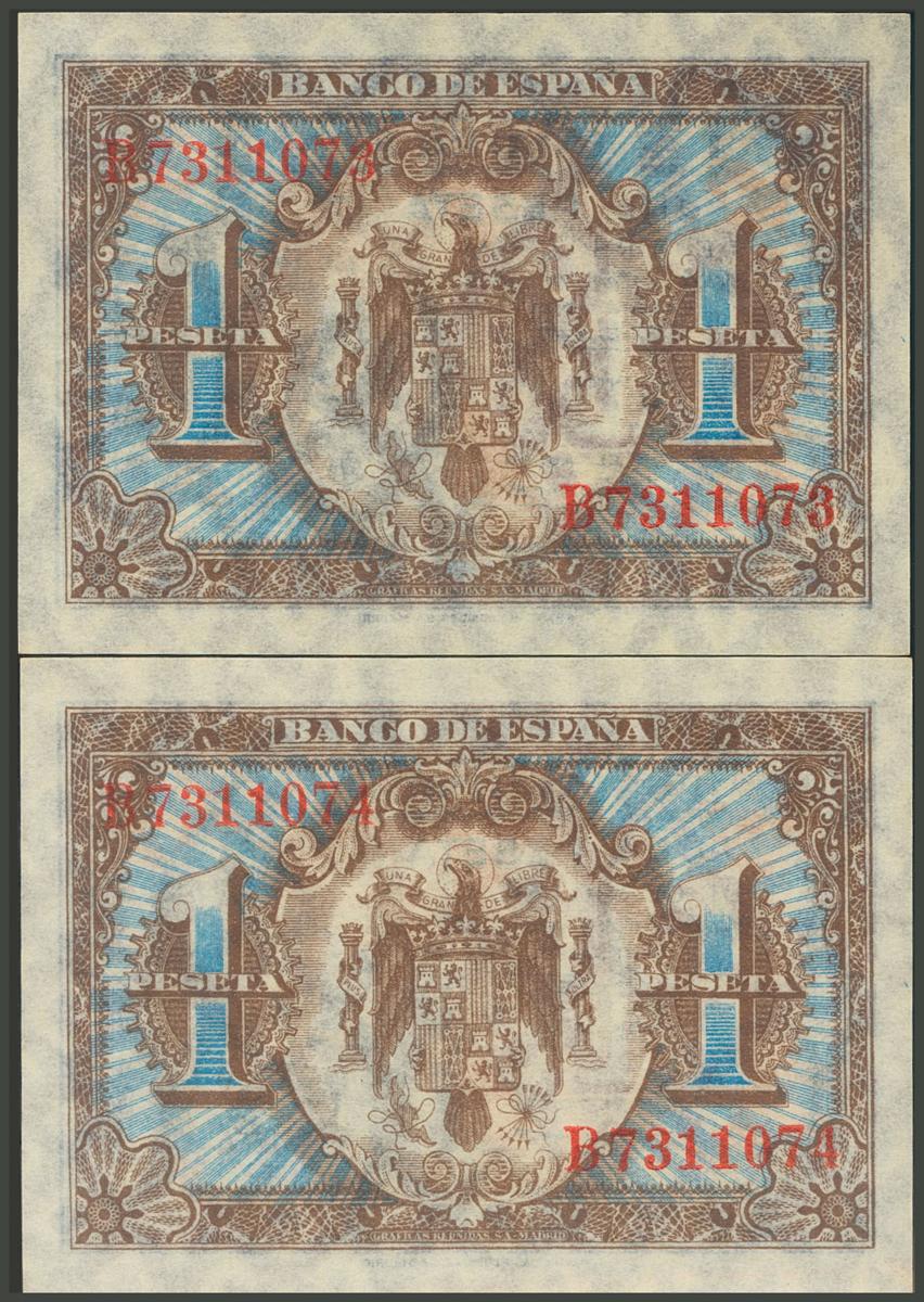 1 Peseta. 1 de Junio de 1940. Pareja correlativa. Serie B. (Edifil 2017: 441a). Conserva todo el apresto original. SC.