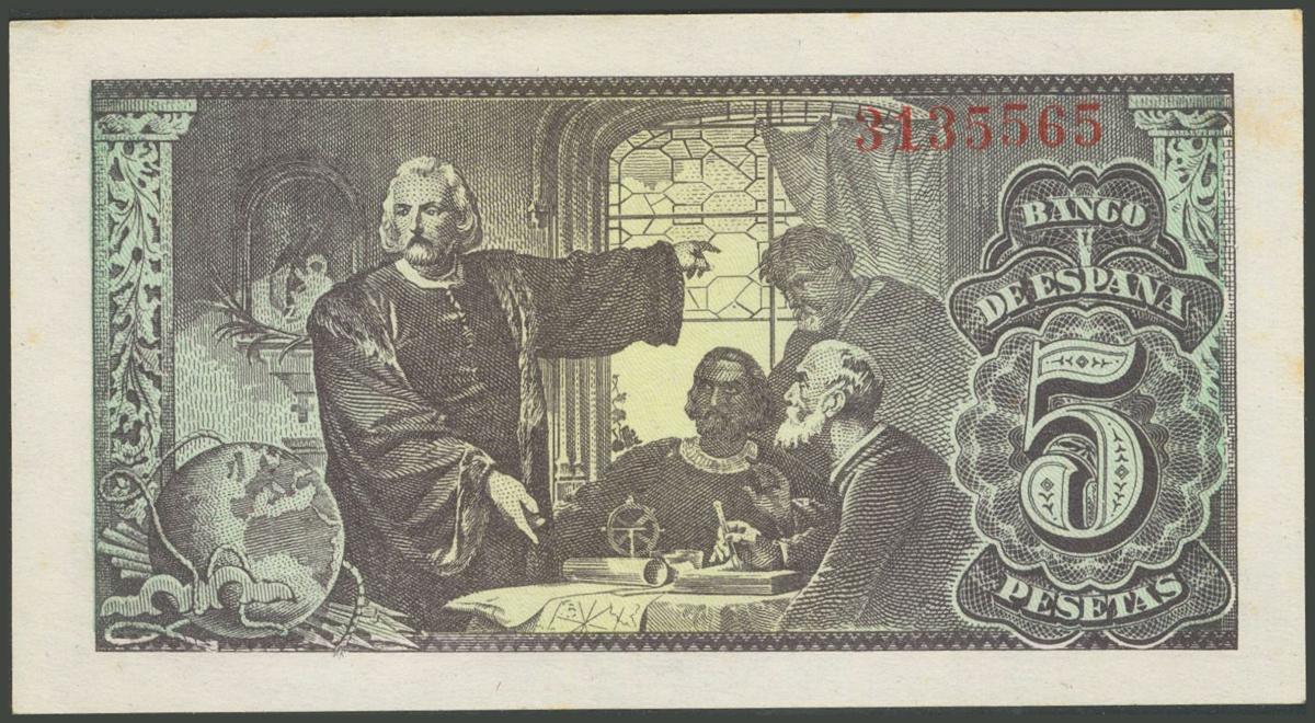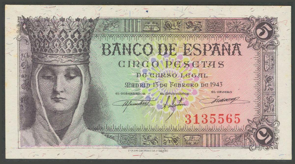 5 Pesetas. 13 de Febrero de 1943. Sin serie. (Edifil 2017: 446). Apresto original, ligeras manchitas. SC-.