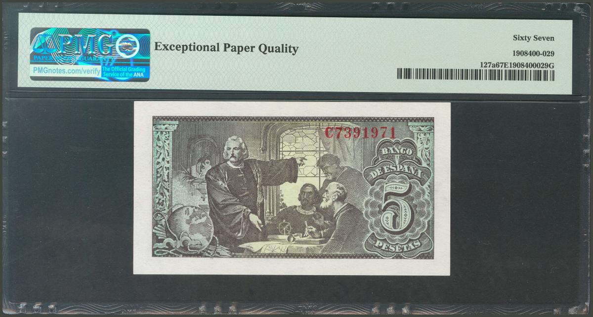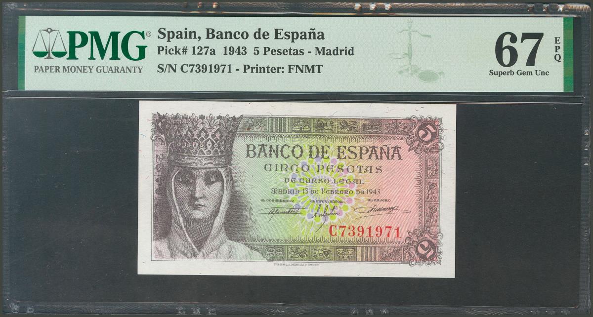 5 Pesetas. 13 de Febrero de 1943. Serie C. (Edifil 2017: 446a). Apresto original. SC. Encapsulado PMG67EPQ.
