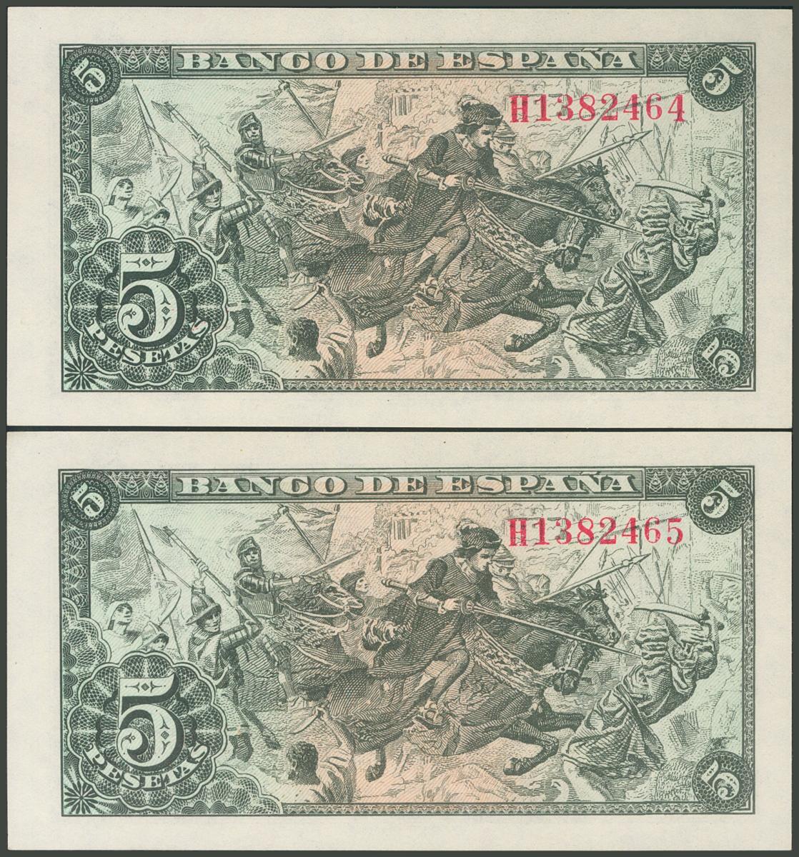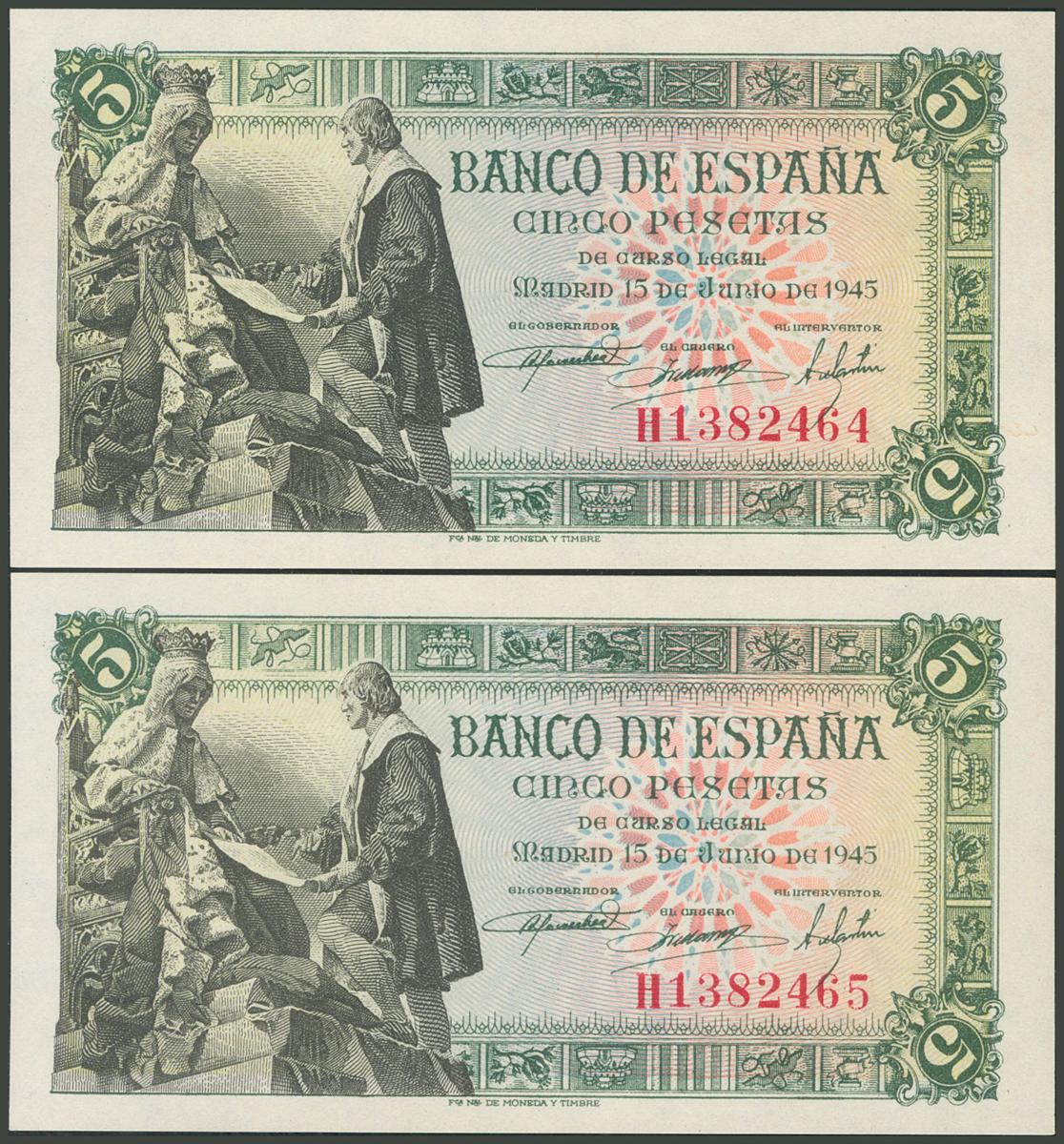 5 Pesetas. 15 de Junio de 1945. Pareja correlativa. Serie H. (Edifil 2017: 449a). Apresto original. SC.