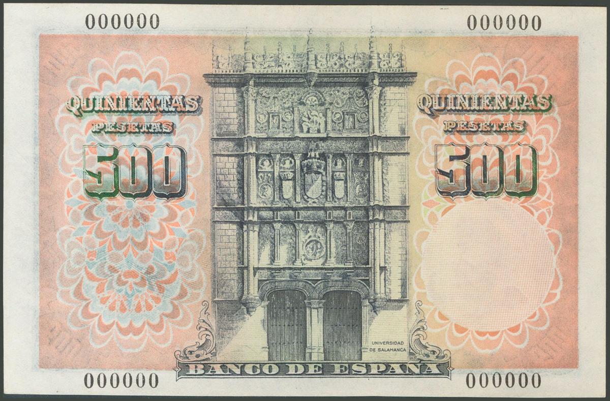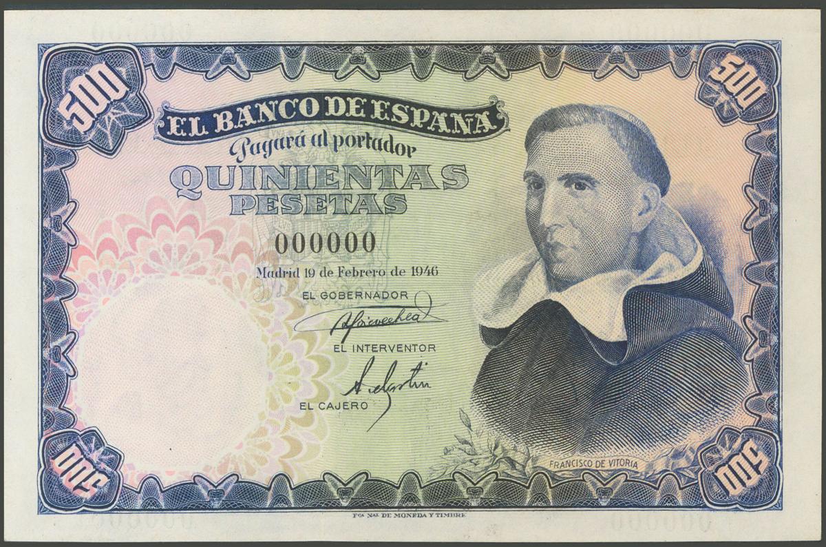 500 Pesetas. 19 de Febrero de 1946. Muestra con numeración 000000. (Edifil 2017: 452N). Rarísimo. SC-.
