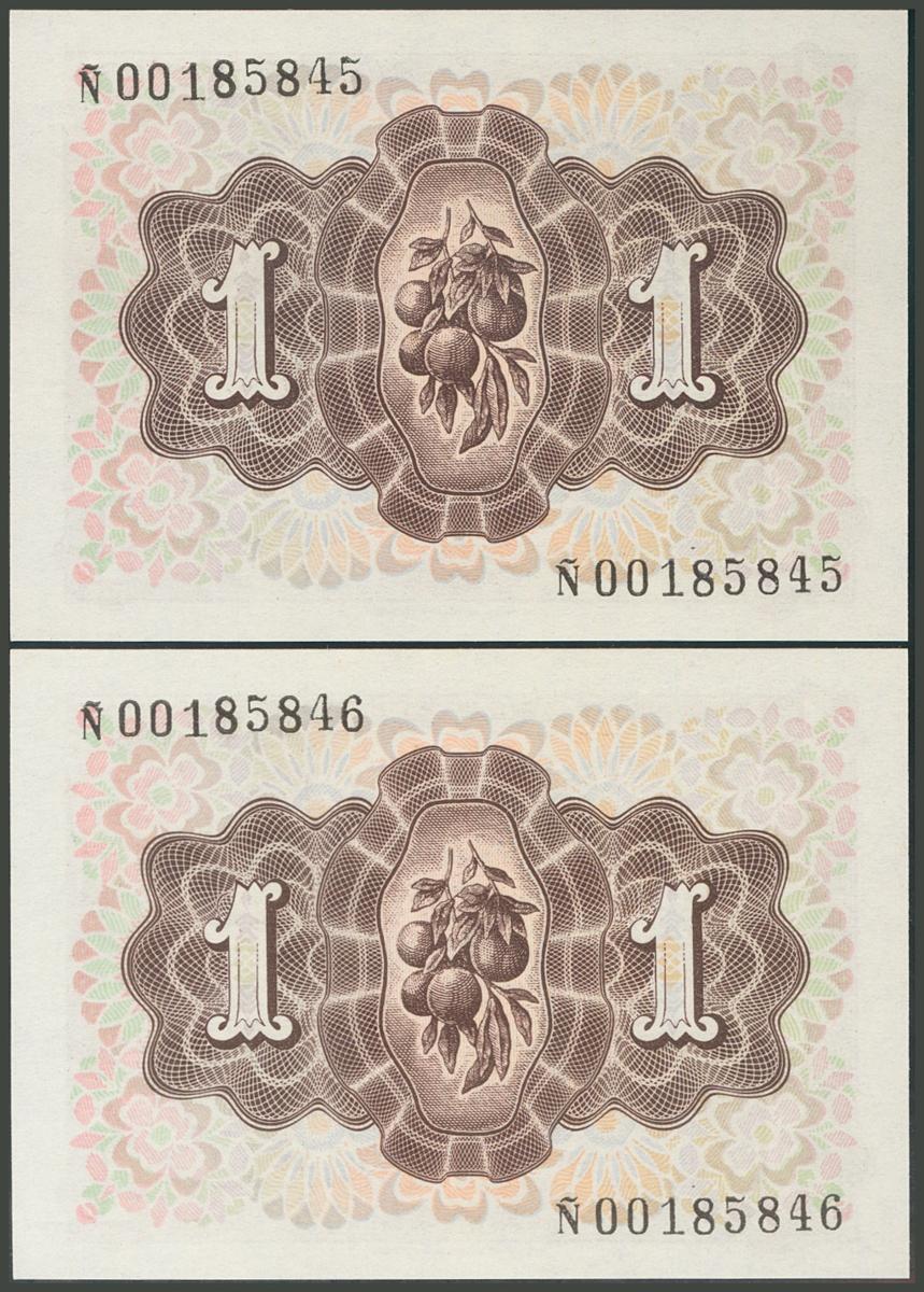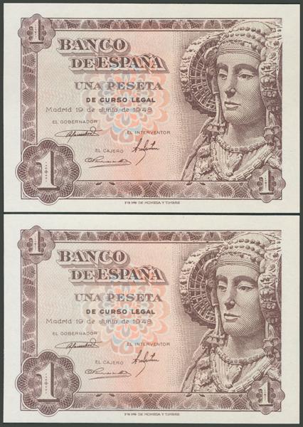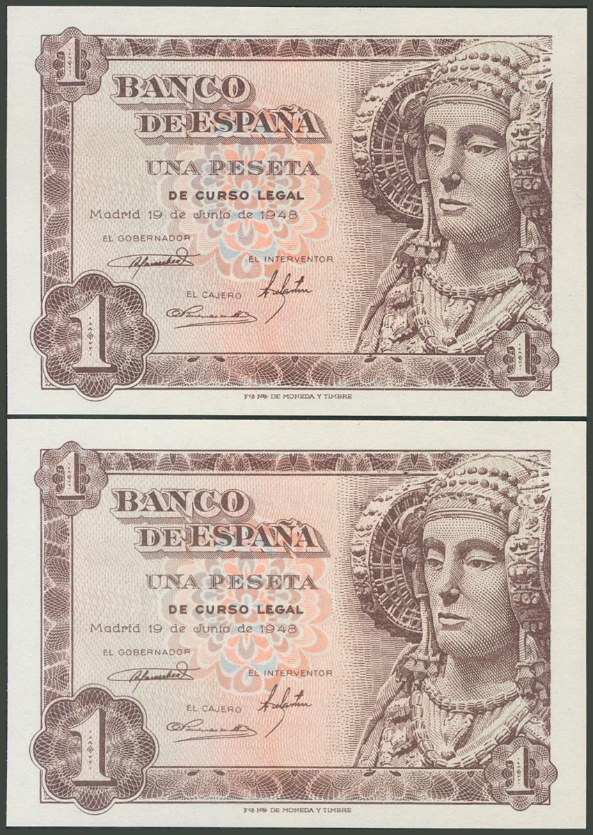 1 Peseta. 19 de Junio de 1948. Pareja correlativa. Serie Ñ, esta serie sólo existe en este billete. (Edifil 2017: 457a). Apresto original. SC.
