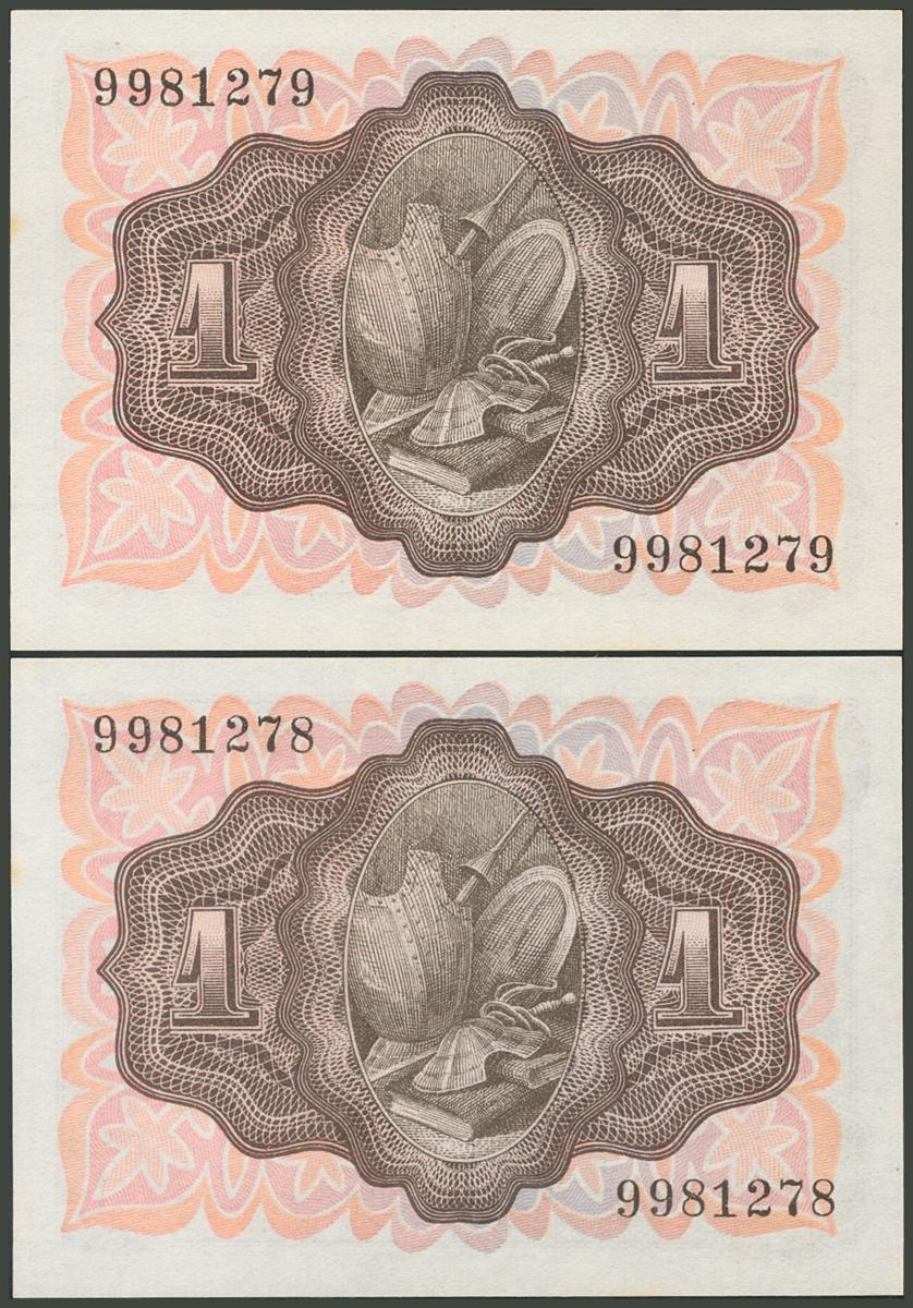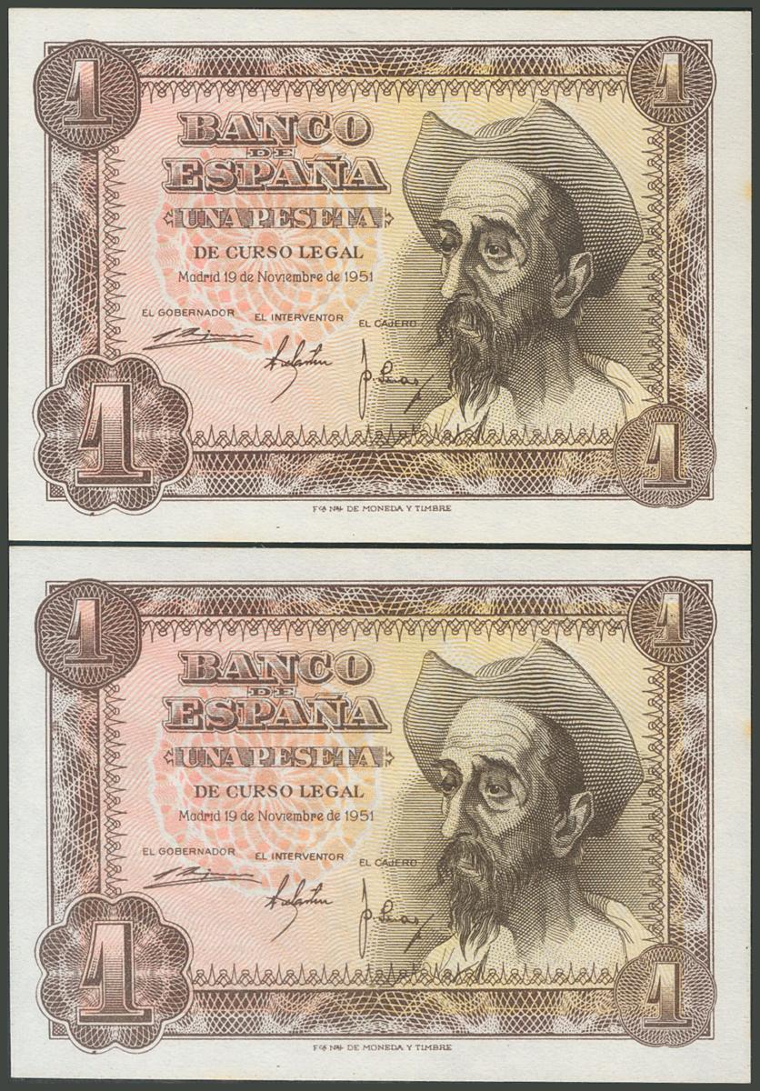 1 Peseta. 19 de Noviembre de 1951. Pareja correlativa. Sin serie. (Edifil 2017: 461). Puntitos del tiempo de escasa consideración. SC-.