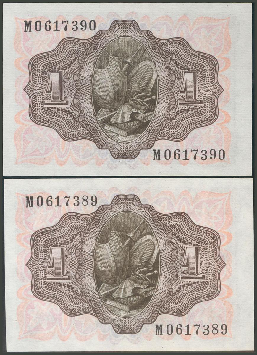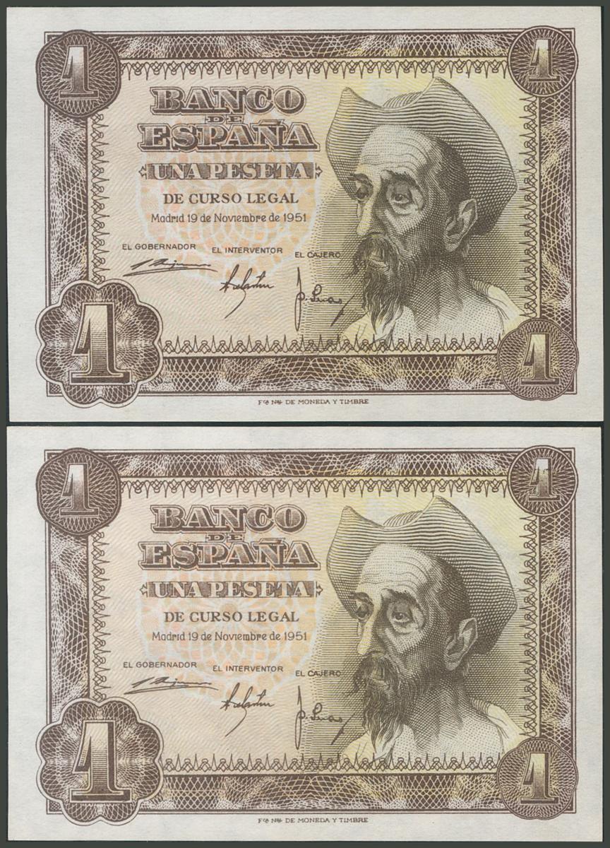 1 Peseta. 19 de Noviembre de 1951. Pareja correlativa. Serie M. (Edifil 2017: 461a). Apresto original. SC.