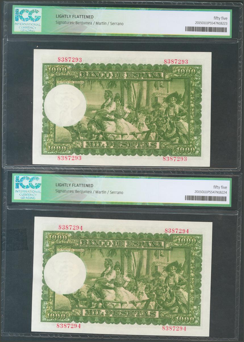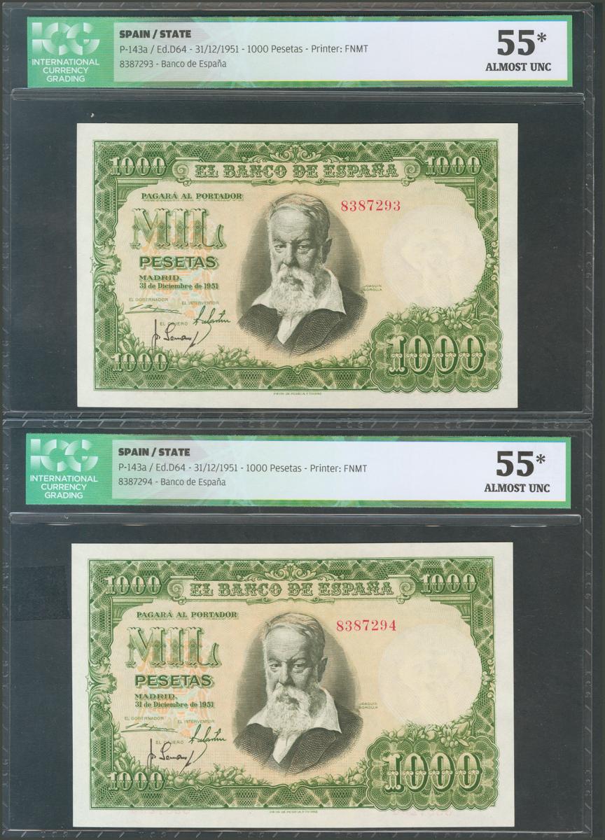 1000 Pesetas. 31 de Diciembre de 1951. Pareja correlativa. Sin serie. (Edifil 2017: 463). EBC+. Encapsulados ICG55, ambos.