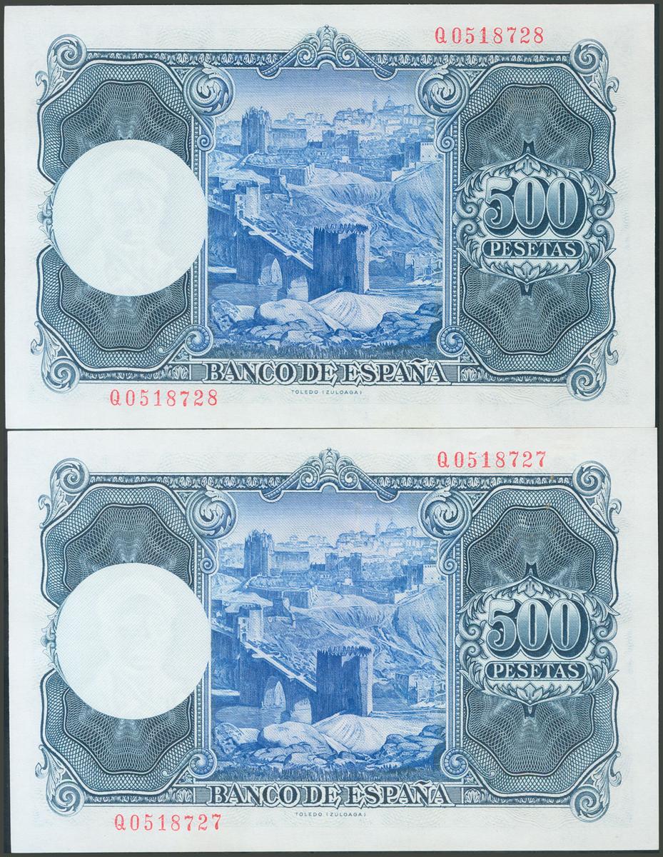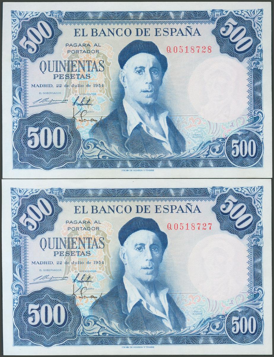 500 Pesetas. 22 de Julio de 1954. Pareja correlativa. Serie Q. (Edifil 2017: 468b). Conserva todo su apresto original. SC.