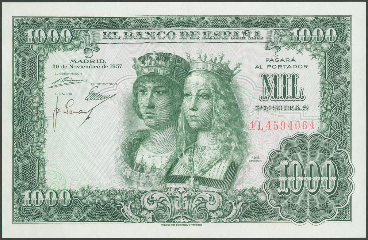 1000 Pesetas. 29 de Noviembre de 1957. Serie 1L. (Edifil 2017: 469b). Conserva parte de su apresto original. EBC+.