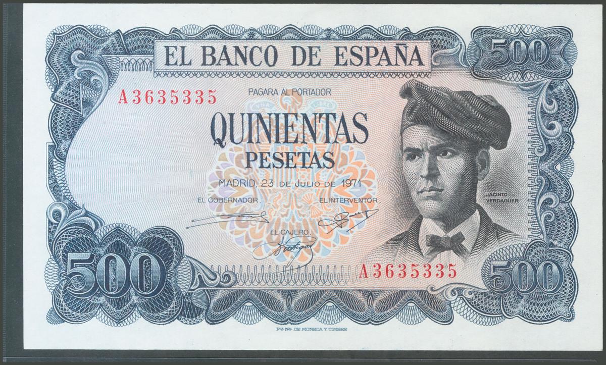 500 Pesetas. 23 de Julio de 1971. Serie A. (Edifil 2017: 473a). Apresto original. SC.