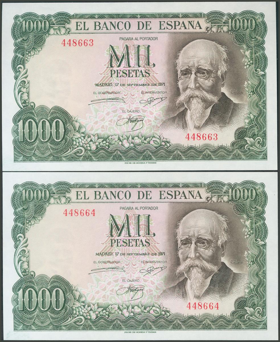 1000 Pesetas. 17 de Abril de 1971. Pareja correlativa. Sin serie. (Edifil 2017: 474). Conserva parte de su apresto original. SC.